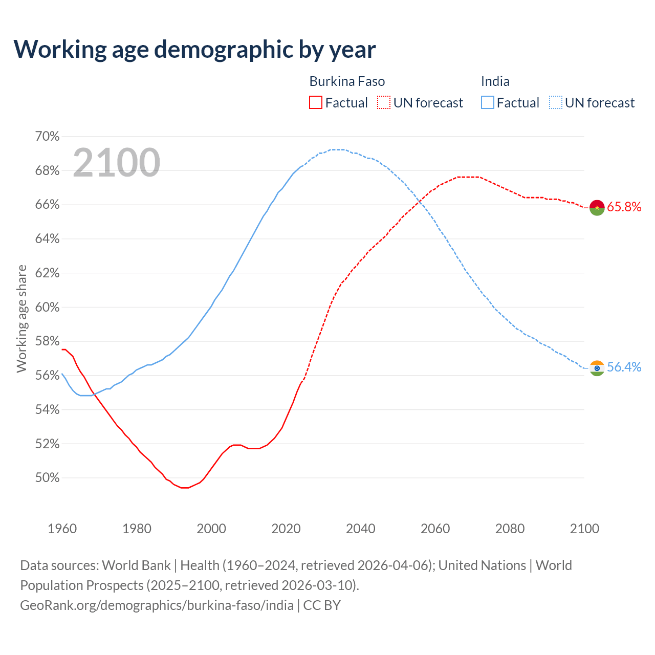 Median age Burkina Faso vs India, 1960-2100