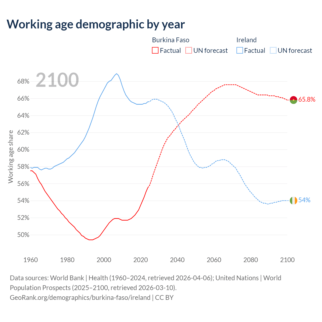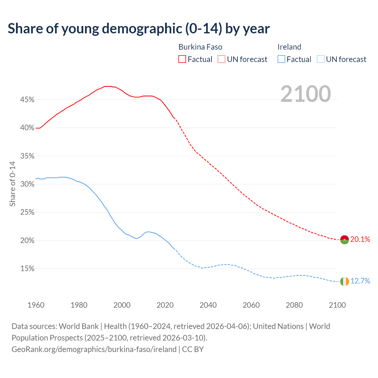 - The share of young demographic (0-15 years old) in Burkina Faso is 41.8% vs 18.6% in Ireland.