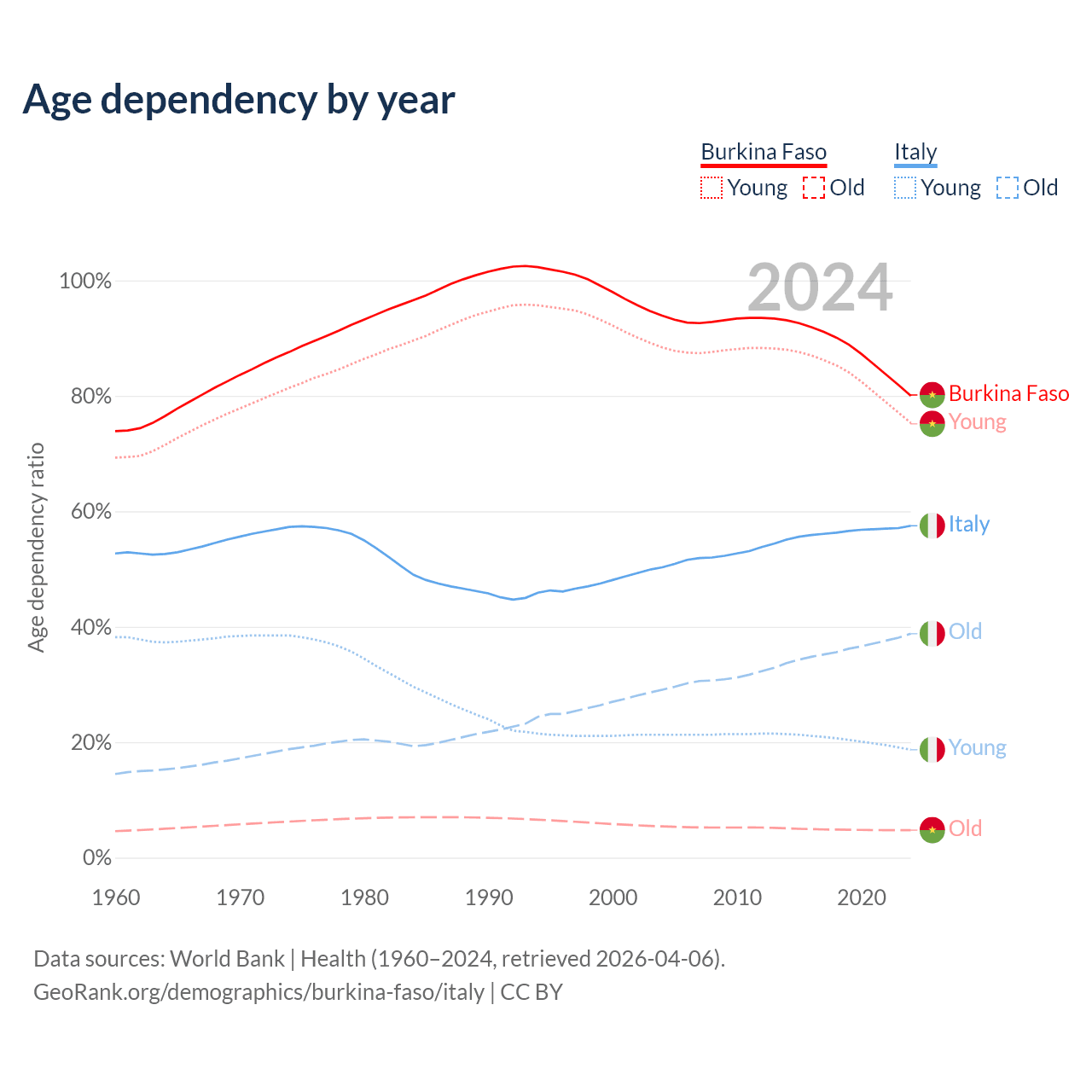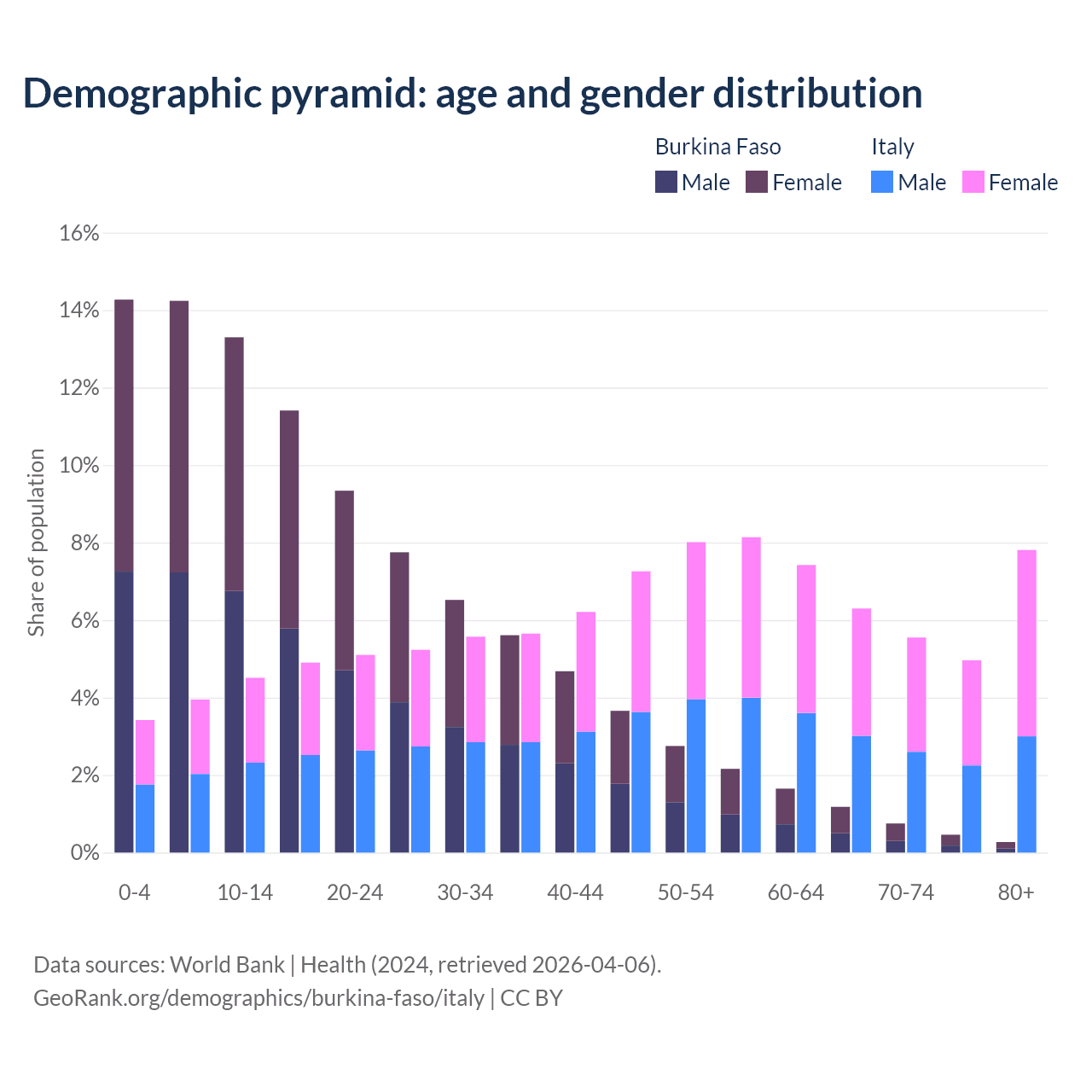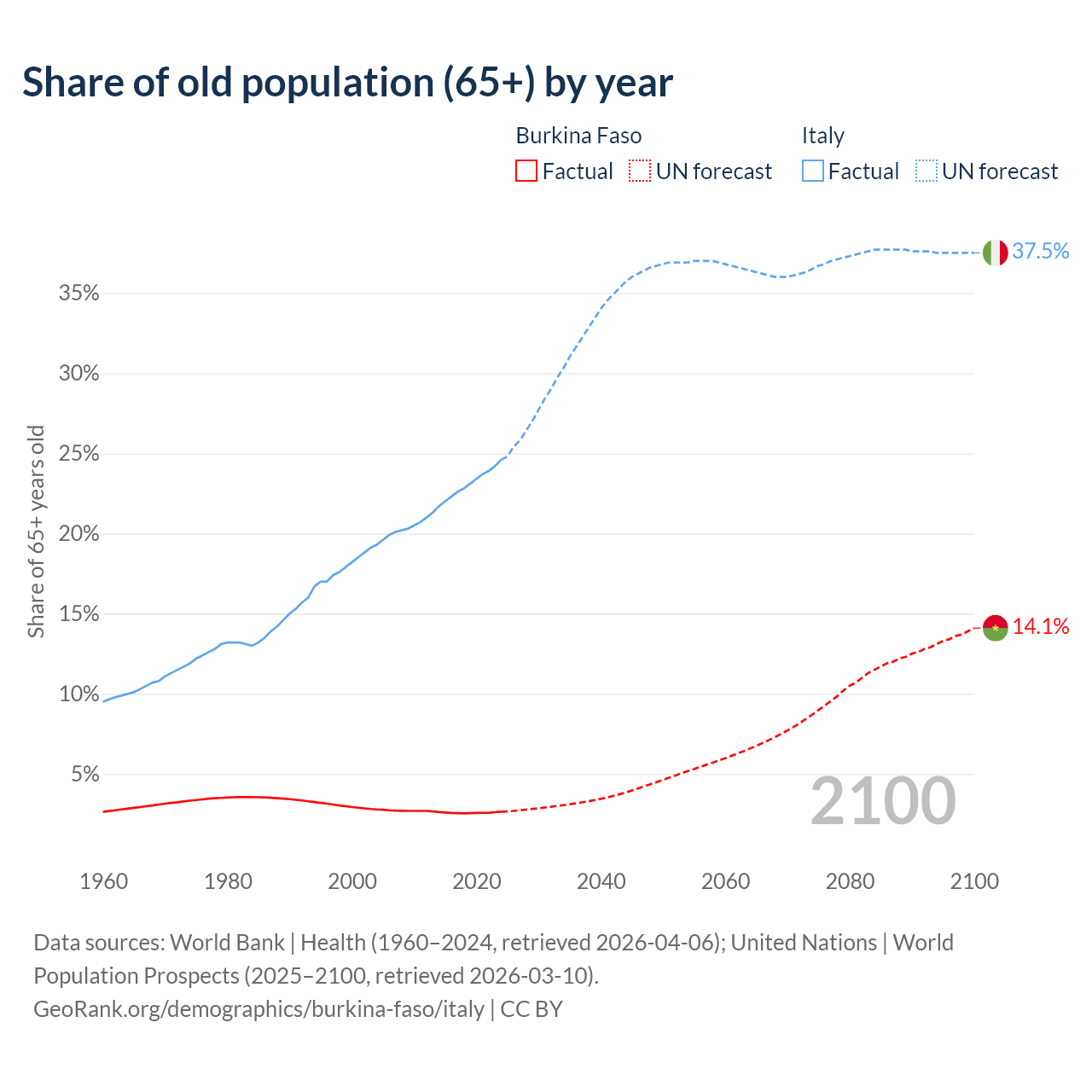 The share of older people aged 65 and over is 2.65% in Burkina Faso and 24.6% in Italy. Life expectancy in Burkina Faso compared to Italy .