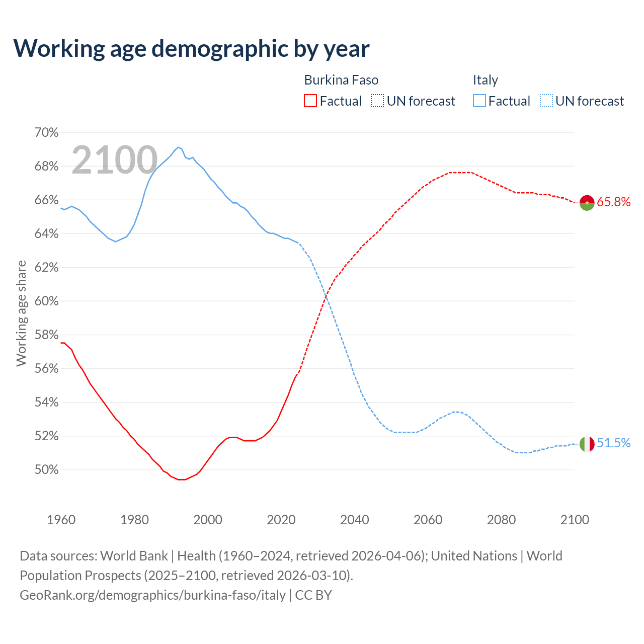 - Burkina Faso has 13.8M working age adults (aged 15-64) vs 37.2M in Italy.