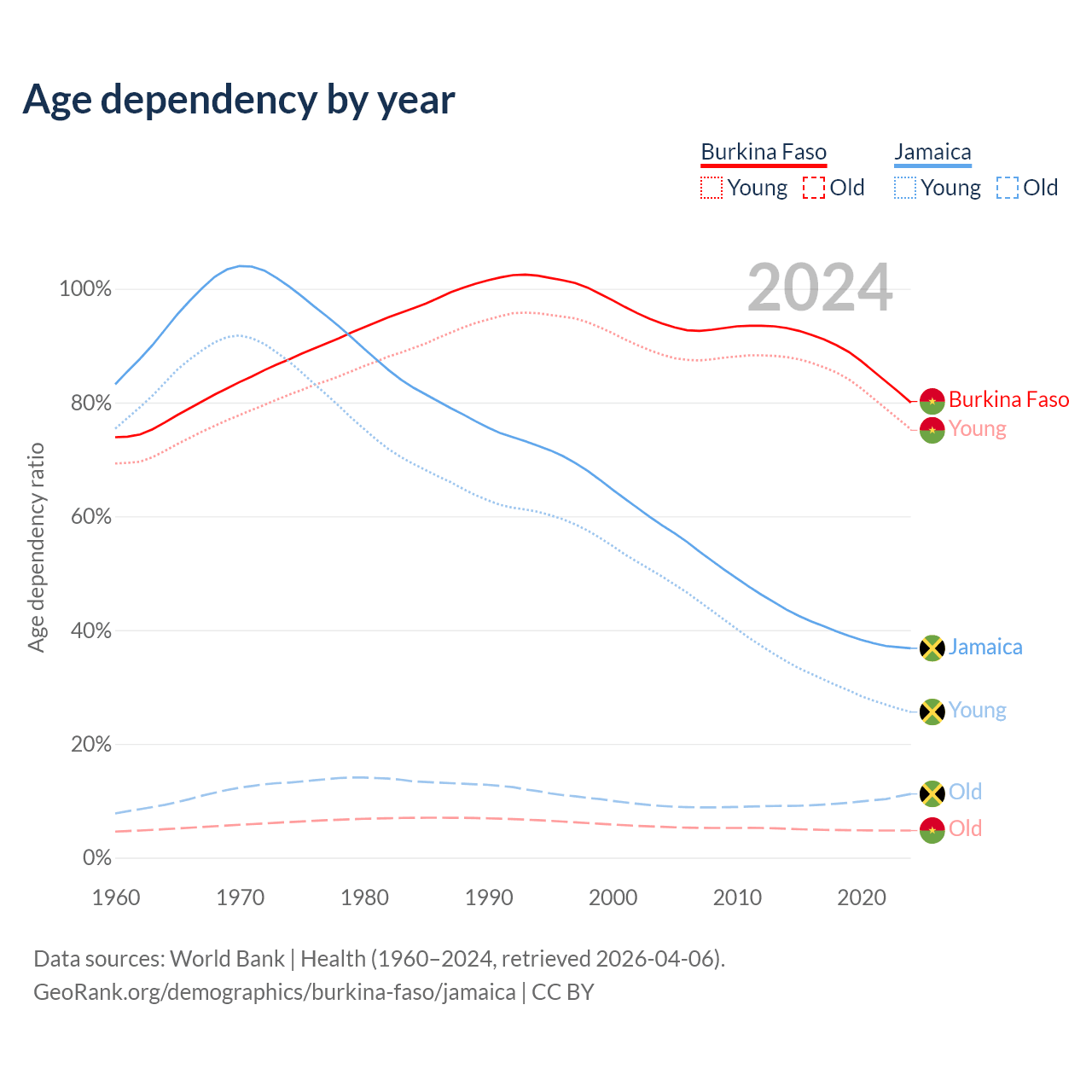 - The share of old-age demographic (65+) in Burkina Faso is 2.65% vs 8.21% in Jamaica.