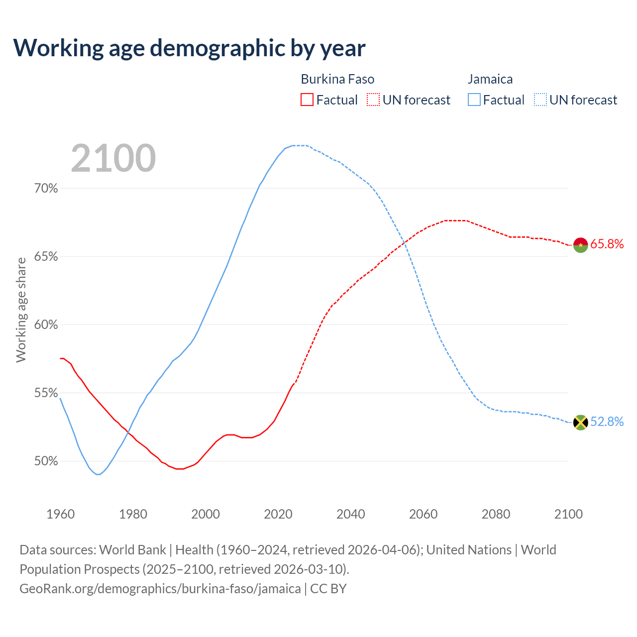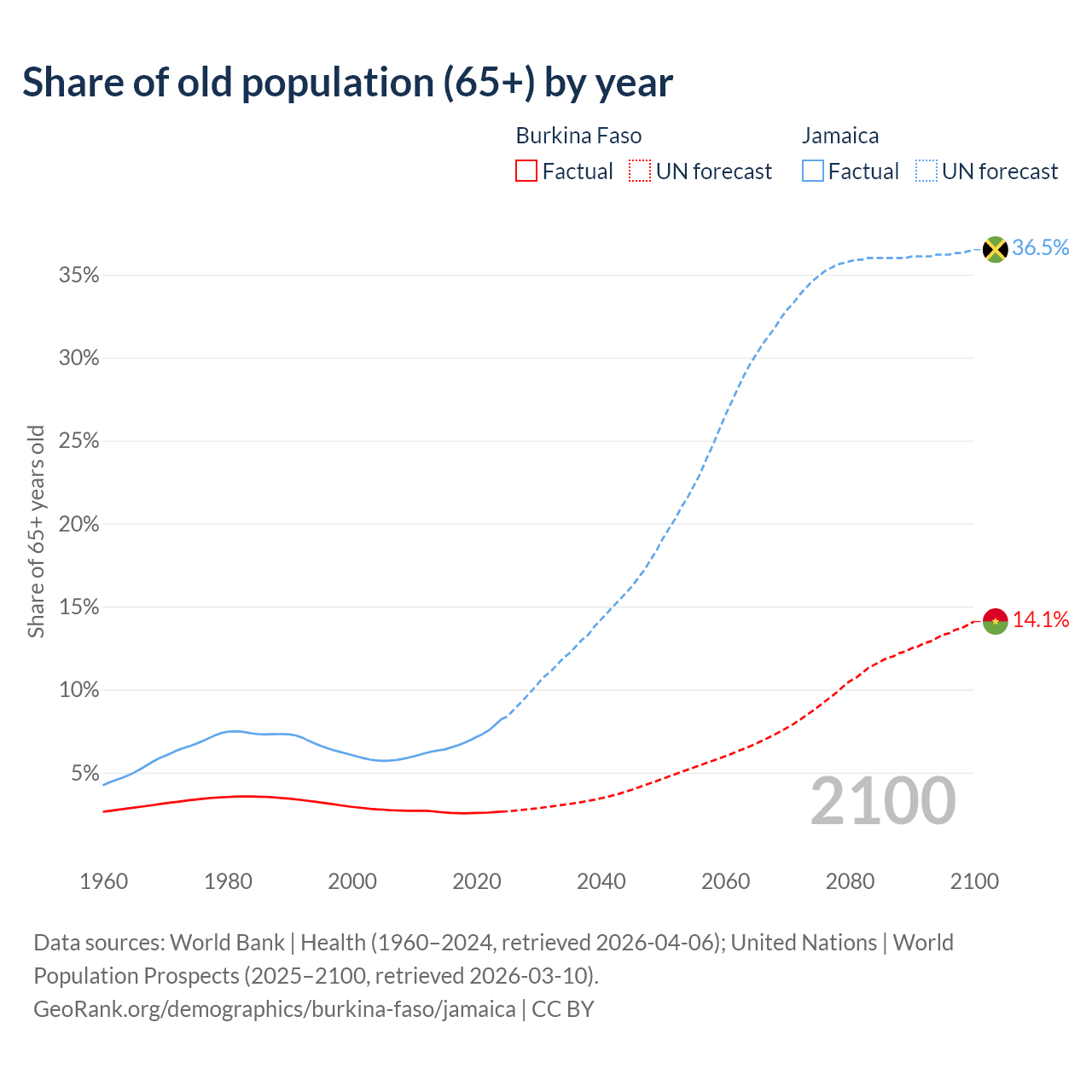 The share of older people aged 65 and over is 2.65% in Burkina Faso and 8.21% in Jamaica. Life expectancy in Burkina Faso compared to Jamaica .