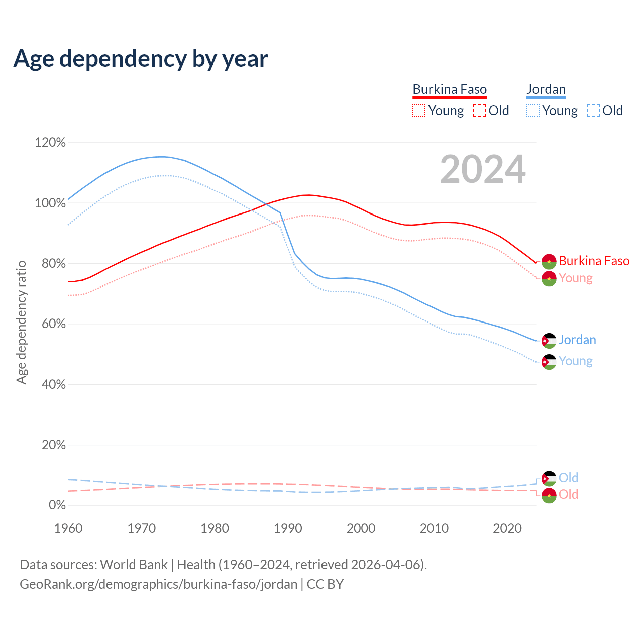 The share of older people aged 65 and over is 2.65% in Burkina Faso and 4.52% in Jordan. Life expectancy in Burkina Faso compared to Jordan .