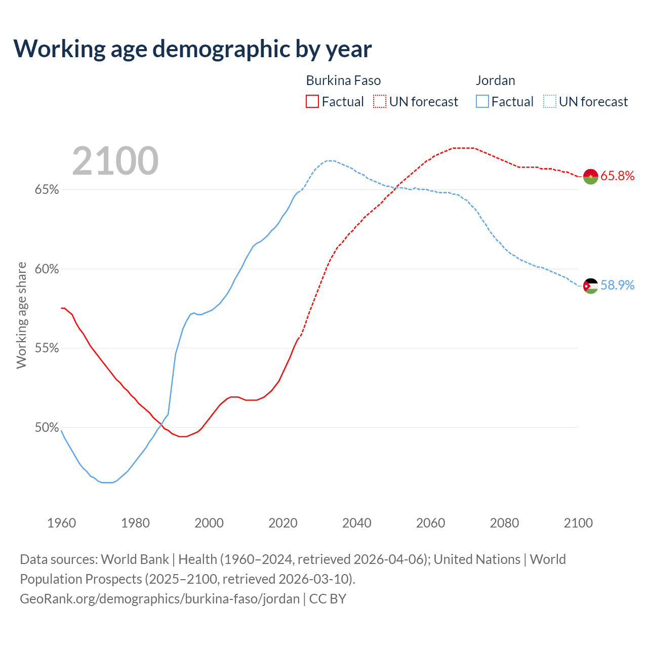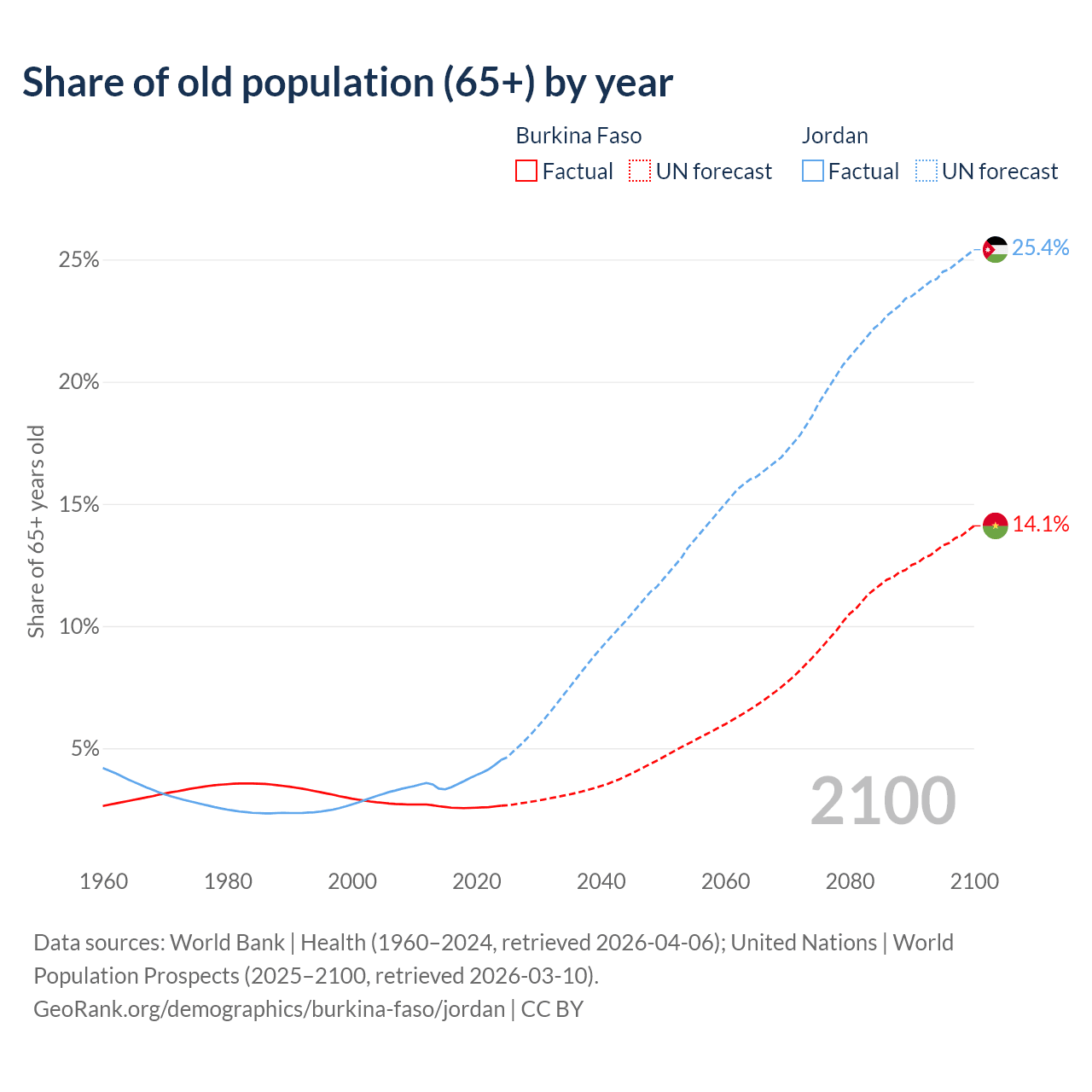Median age Burkina Faso vs Jordan, 1960-2100
