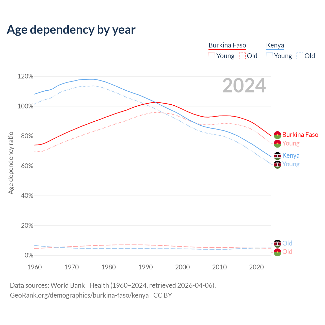 The share of older people aged 65 and over is 2.65% in Burkina Faso and 2.97% in Kenya. Life expectancy in Burkina Faso compared to Kenya .