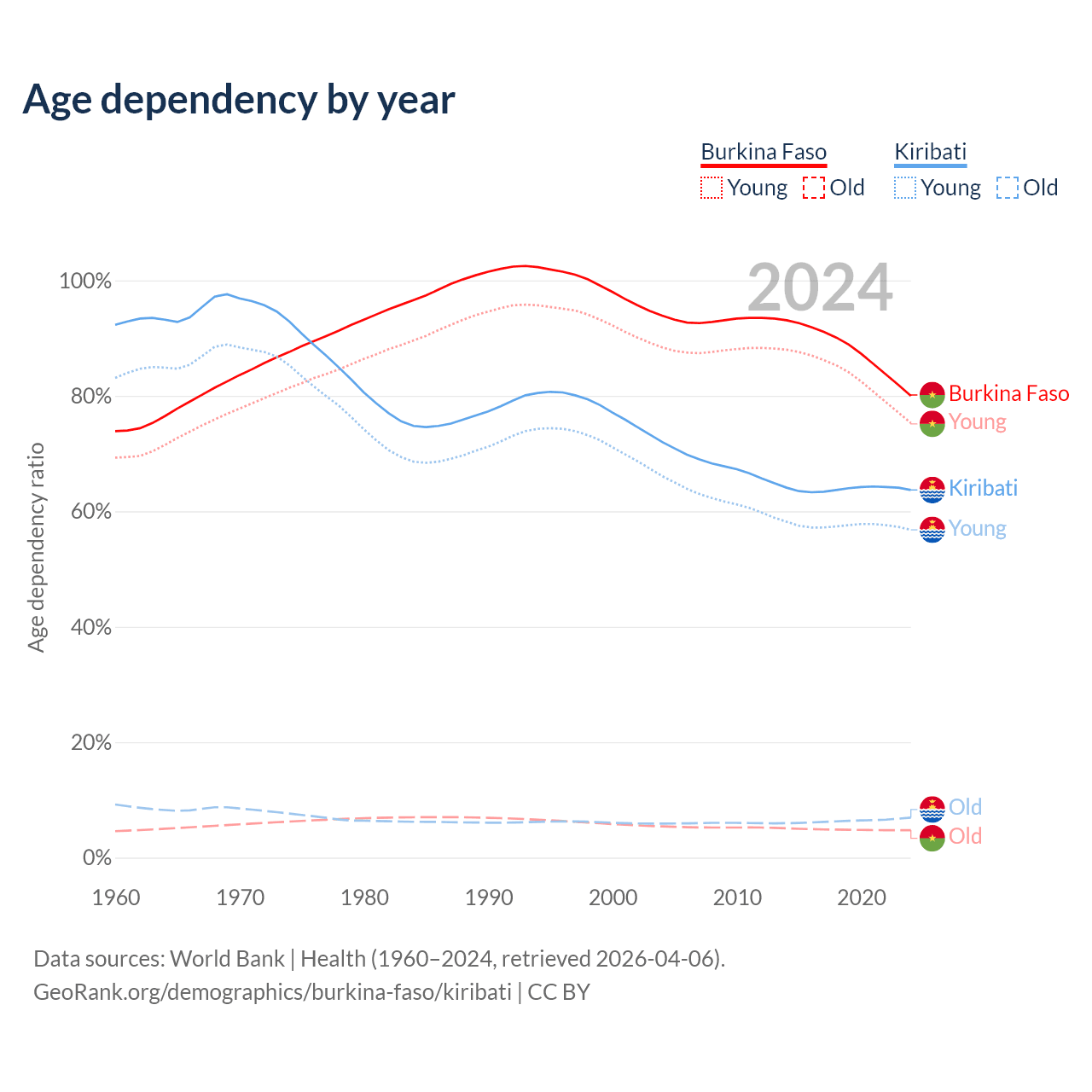 - The share of old-age demographic (65+) in Burkina Faso is 2.65% vs 4.24% in Kiribati.