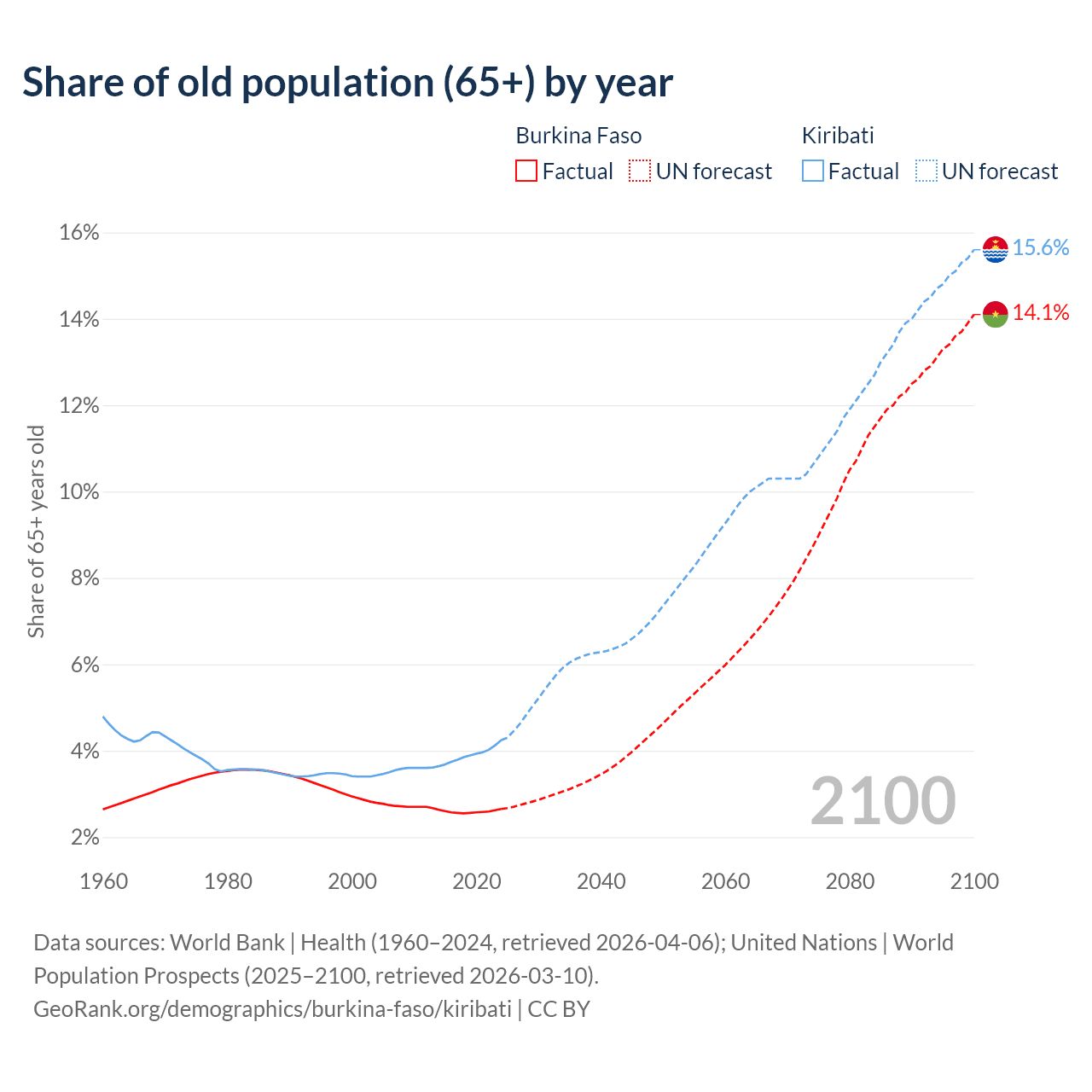 The share of older people aged 65 and over is 2.65% in Burkina Faso and 4.24% in Kiribati. Life expectancy in Burkina Faso compared to Kiribati .