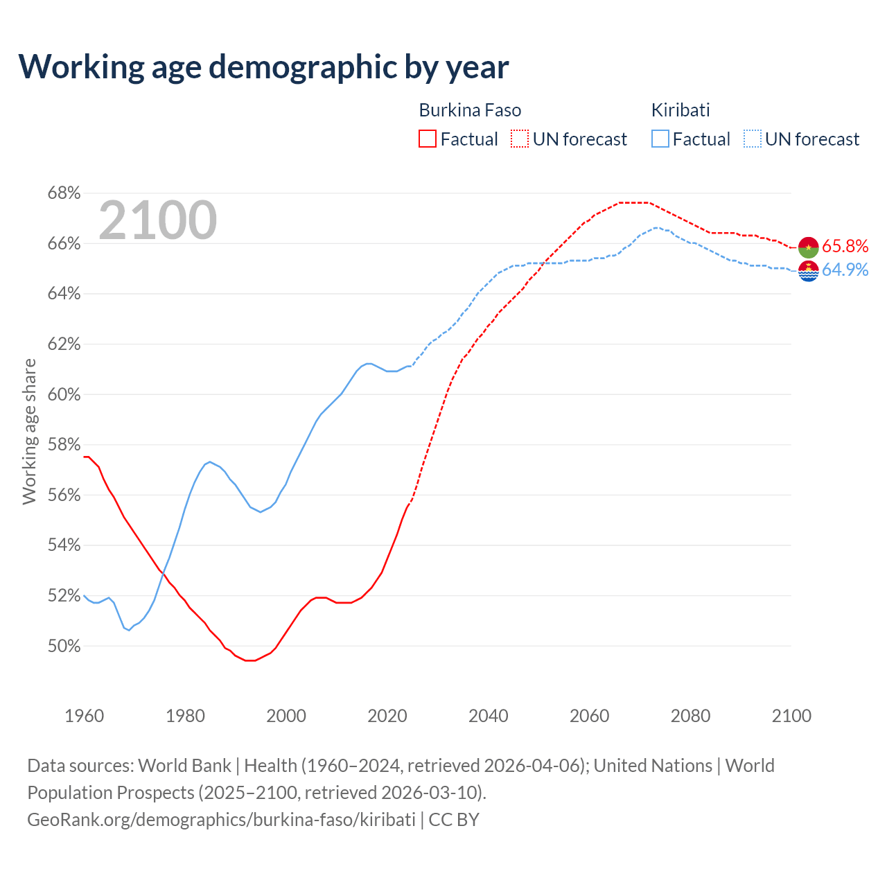 - Burkina Faso has 13.8M working age adults (aged 15-64) vs 84.9K in Kiribati.