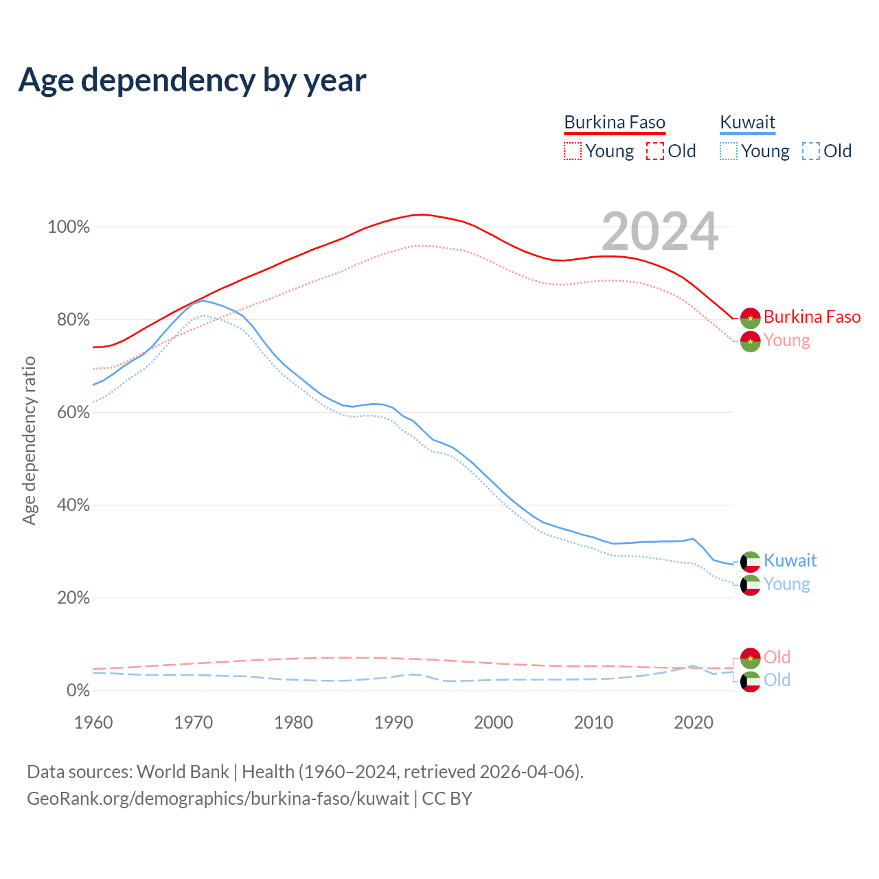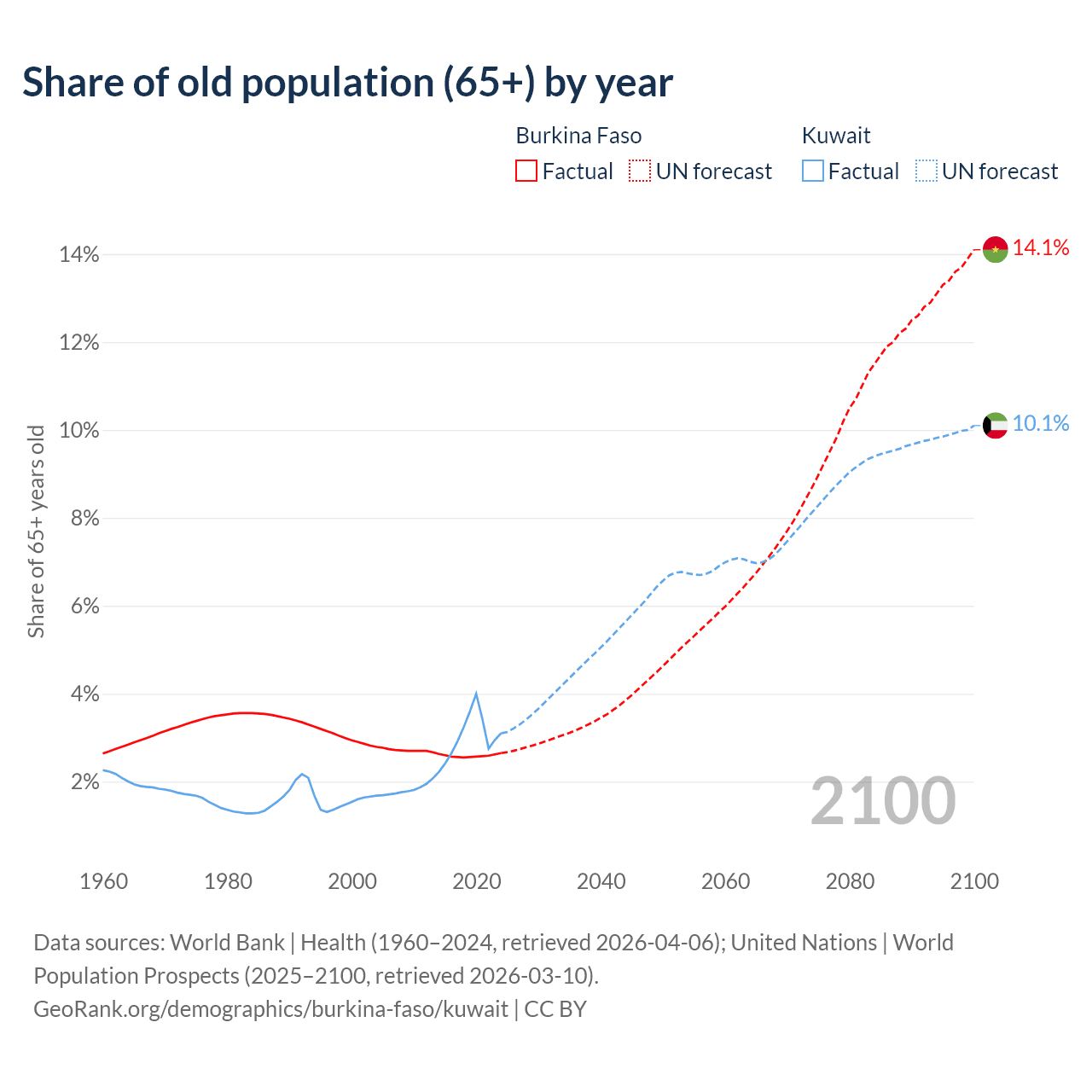 The share of older people aged 65 and over is 2.65% in Burkina Faso and 3.1% in Kuwait. Life expectancy in Burkina Faso compared to Kuwait .