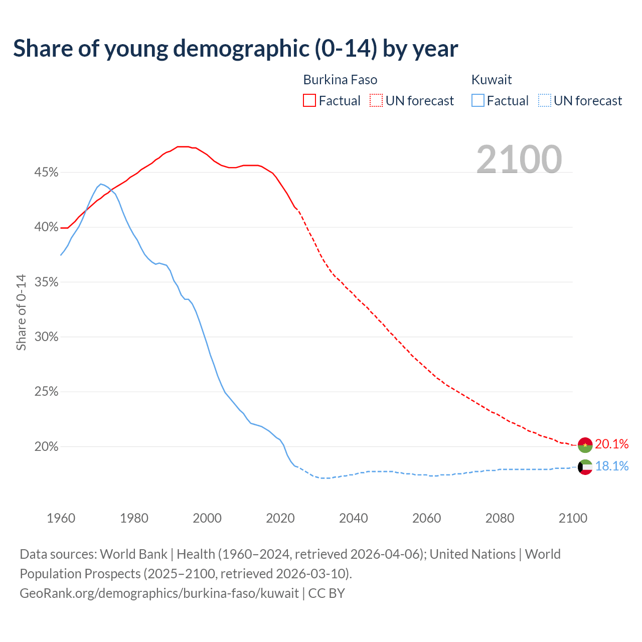 - The share of young demographic (0-15 years old) in Burkina Faso is 41.8% vs 18.2% in Kuwait.