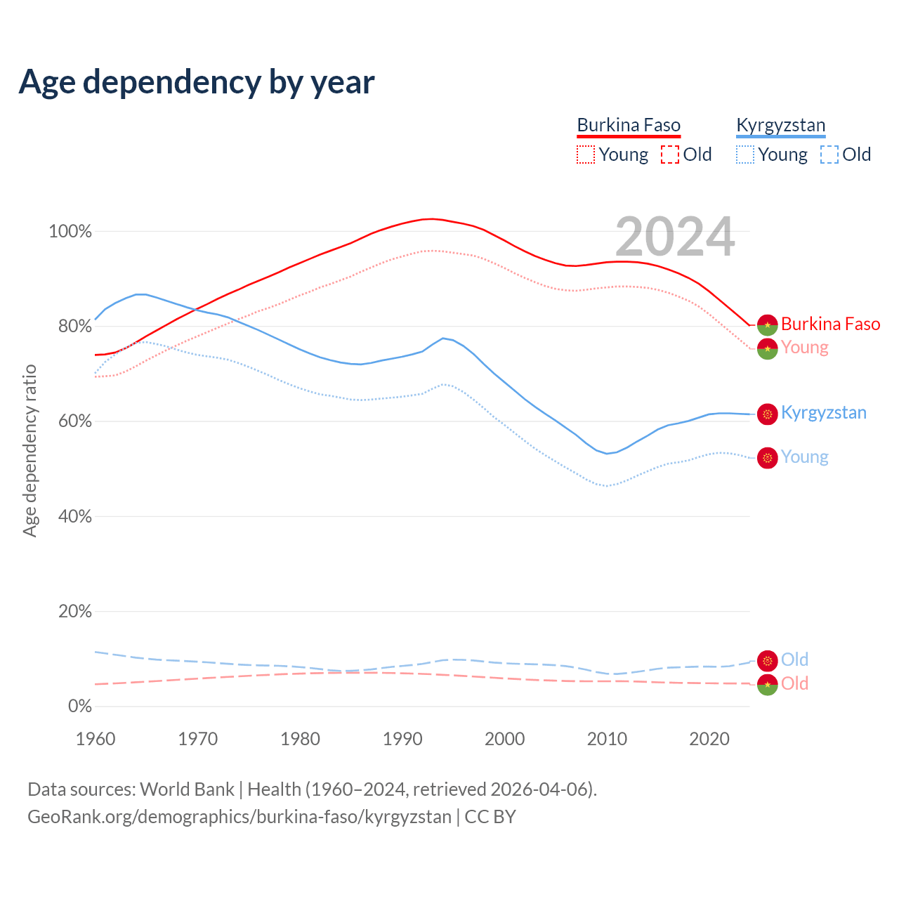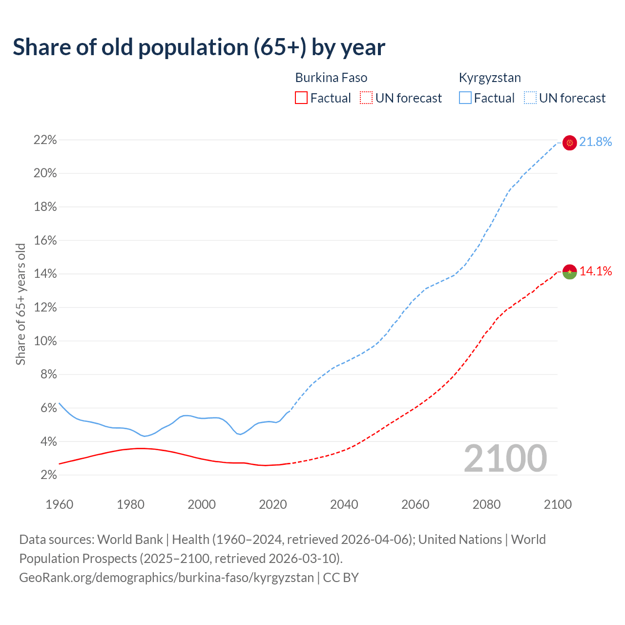 - The share of old-age demographic (65+) in Burkina Faso is 2.65% vs 5.68% in Kyrgyzstan.