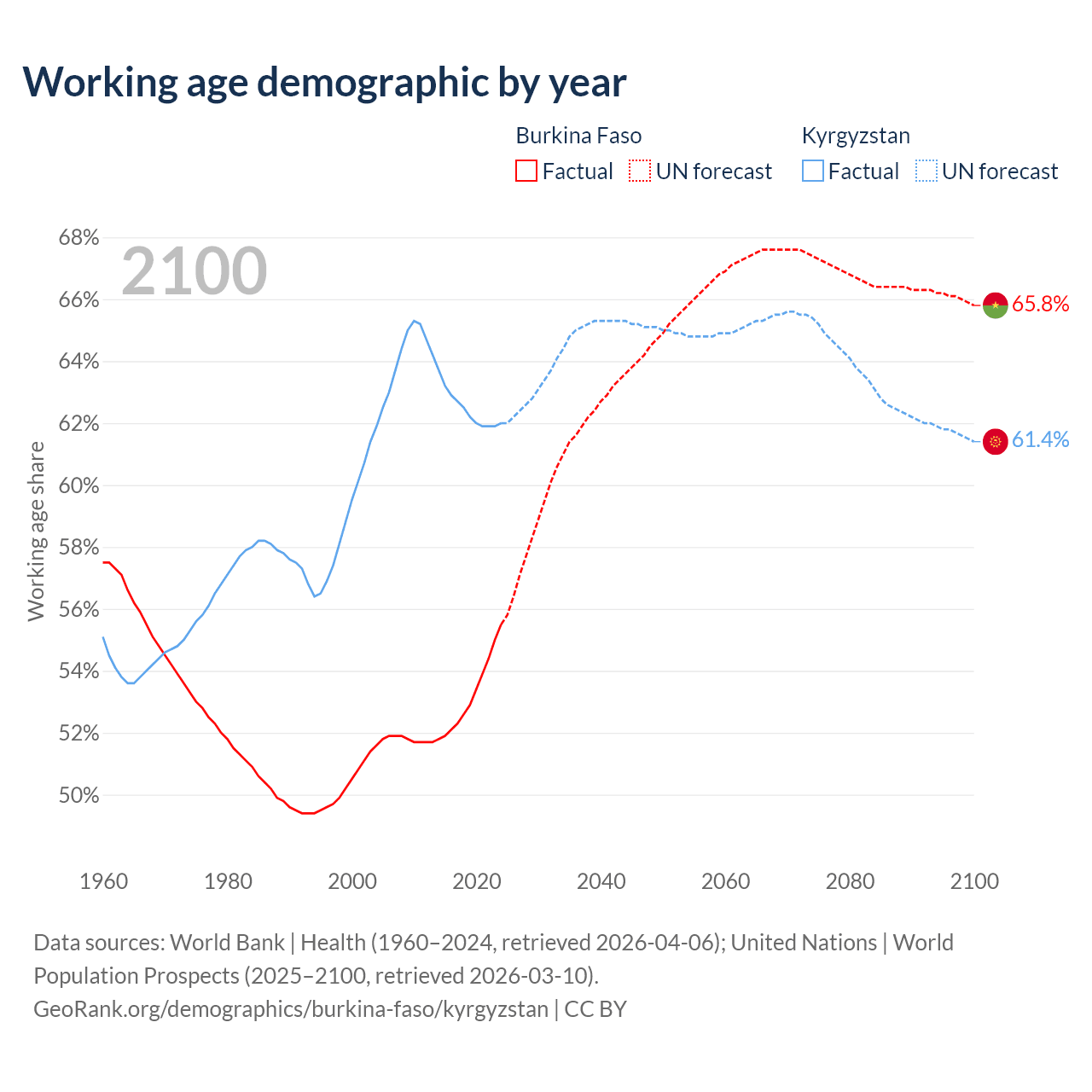 - Burkina Faso has 13.8M working age adults (aged 15-64) vs 4.63M in Kyrgyzstan.