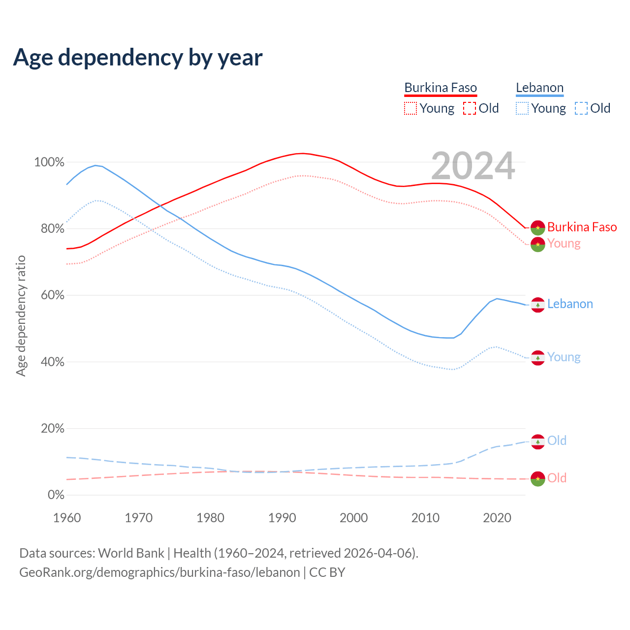 - Burkina Faso is ranked 183/196 by median age (oldest to youngest) vs 106/196 for Lebanon.