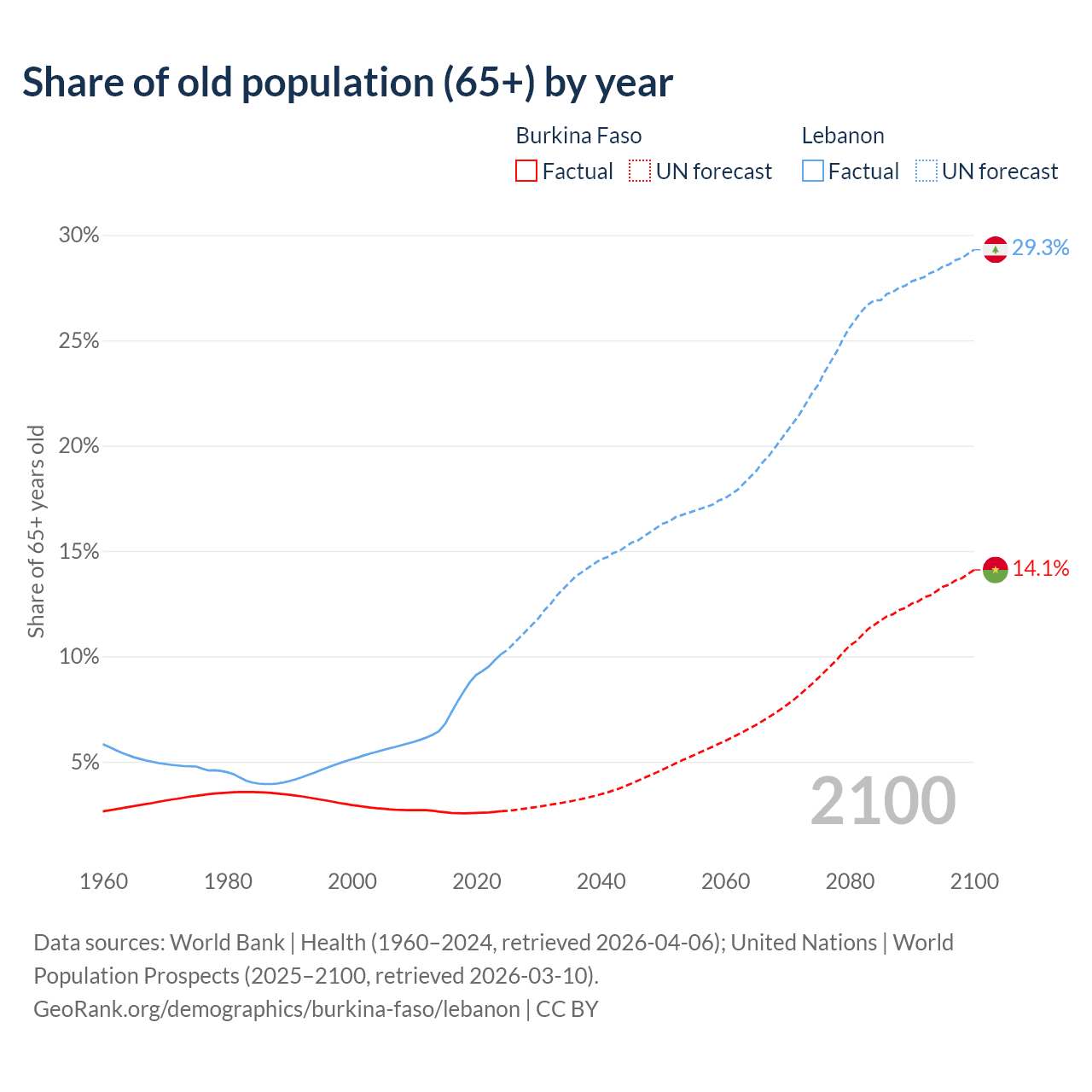 The share of older people aged 65 and over is 2.65% in Burkina Faso and 10.1% in Lebanon. Life expectancy in Burkina Faso compared to Lebanon .
