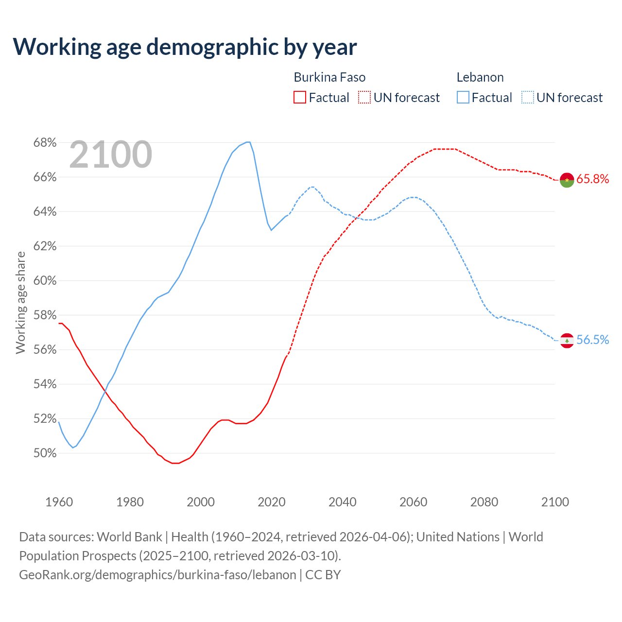 - Burkina Faso has 13.8M working age adults (aged 15-64) vs 3.76M in Lebanon.