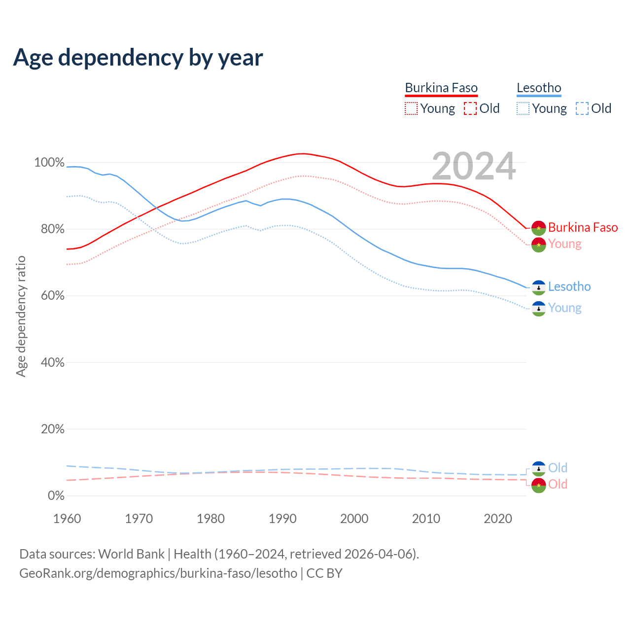 - Burkina Faso is ranked 183/196 by median age (oldest to youngest) vs 143/196 for Lesotho.