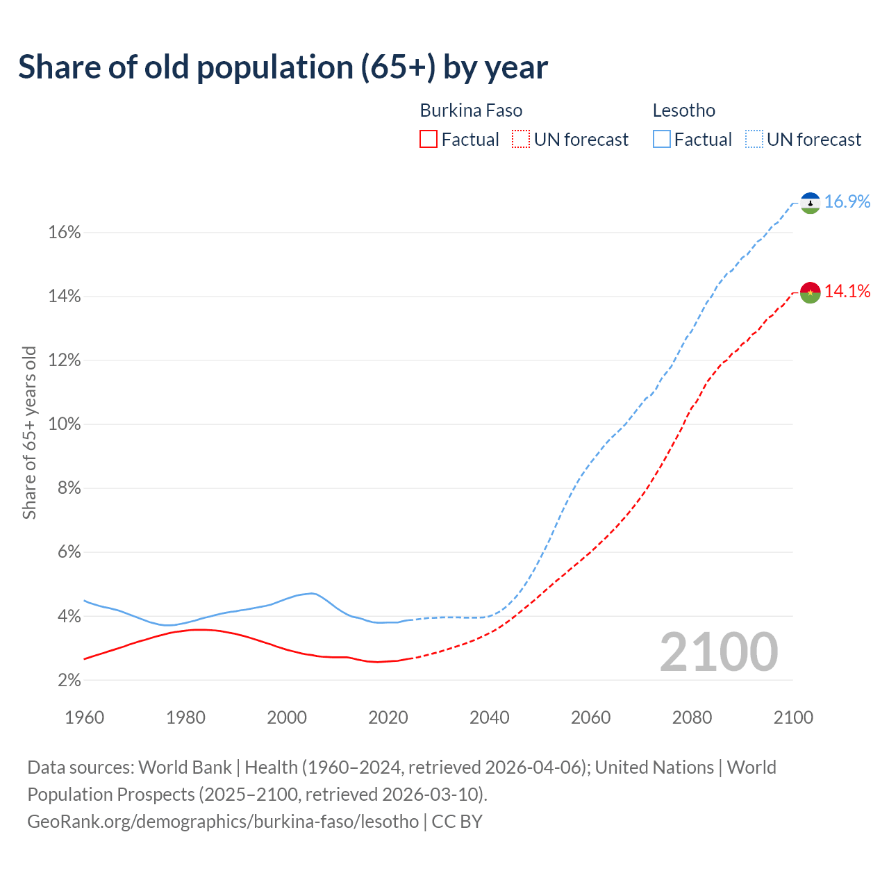 The share of older people aged 65 and over is 2.65% in Burkina Faso and 3.86% in Lesotho. Life expectancy in Burkina Faso compared to Lesotho .