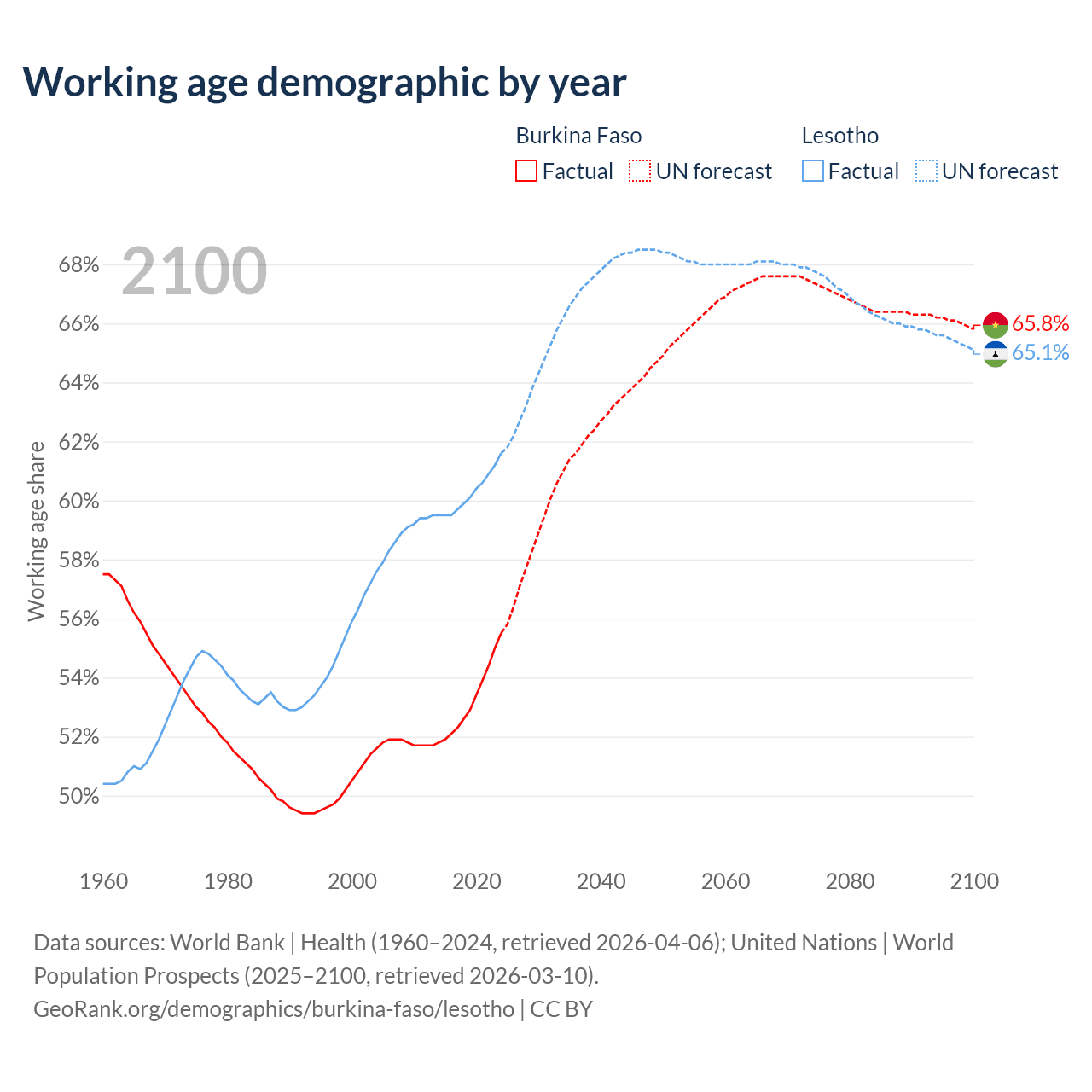 Median age Burkina Faso vs Lesotho, 1960-2100