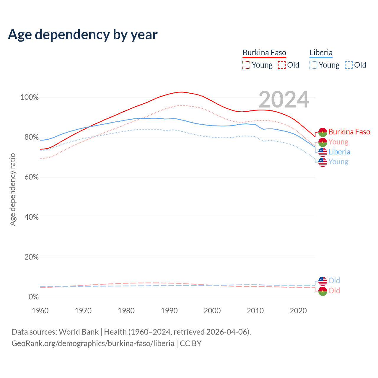 - Burkina Faso is ranked 183/196 by median age (oldest to youngest) vs 169/196 for Liberia.