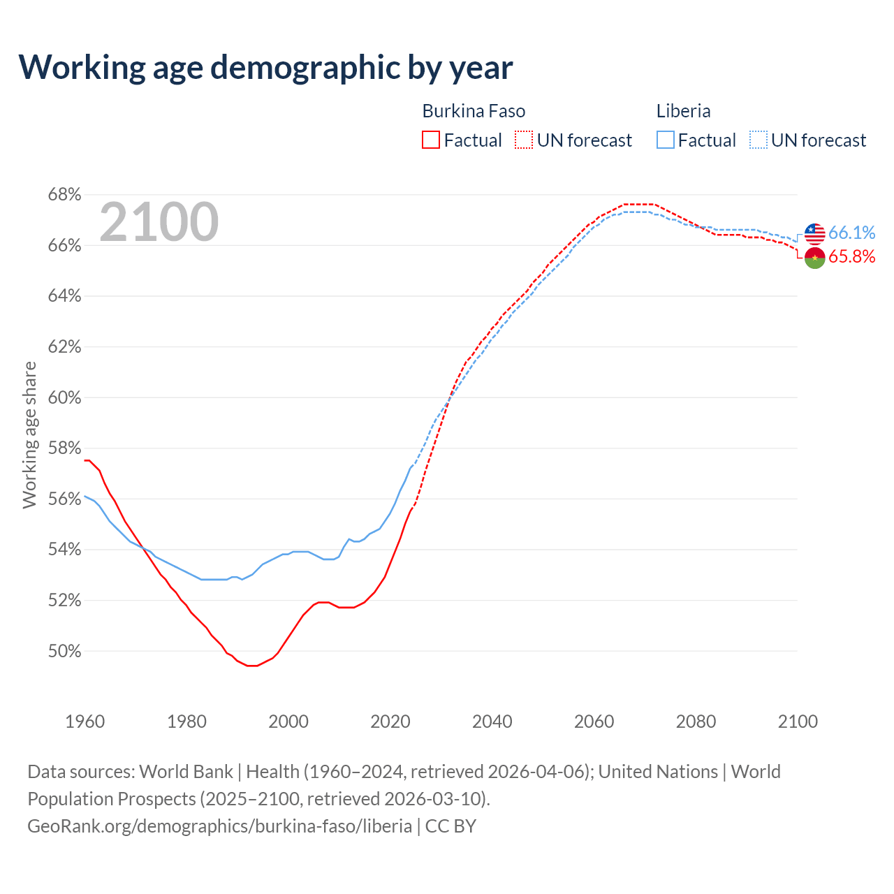 - Burkina Faso has 13.8M working age adults (aged 15-64) vs 3.37M in Liberia.