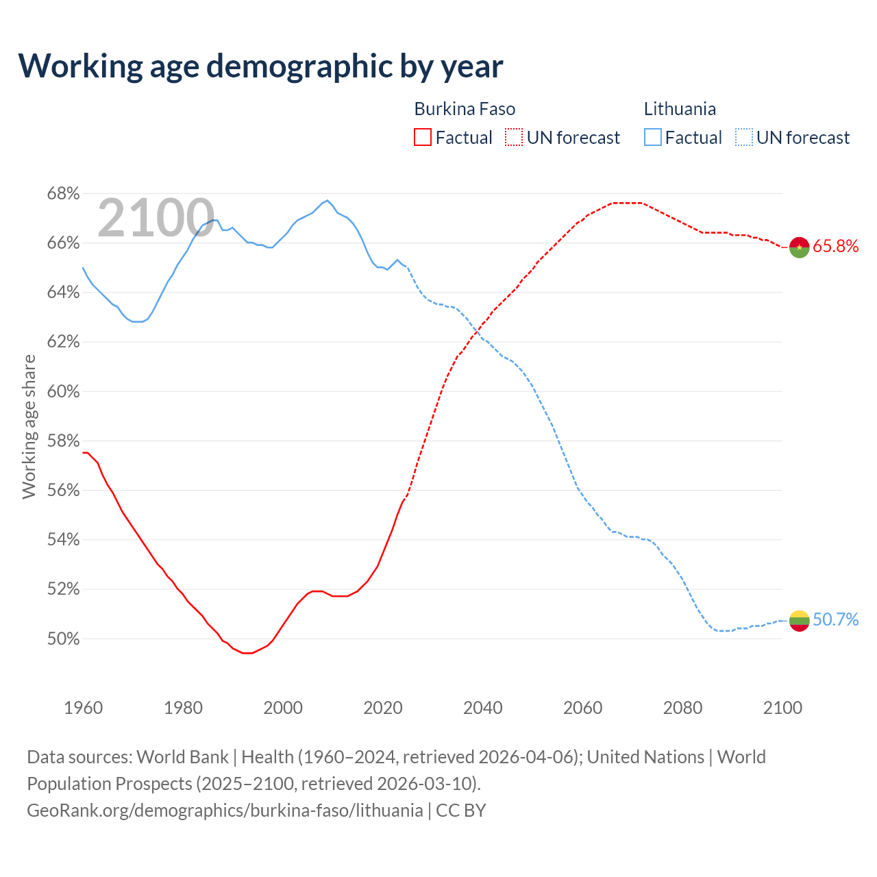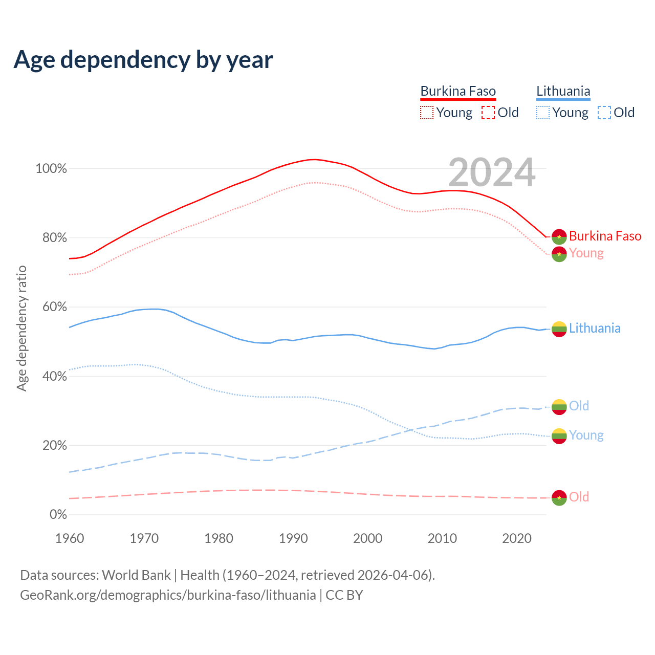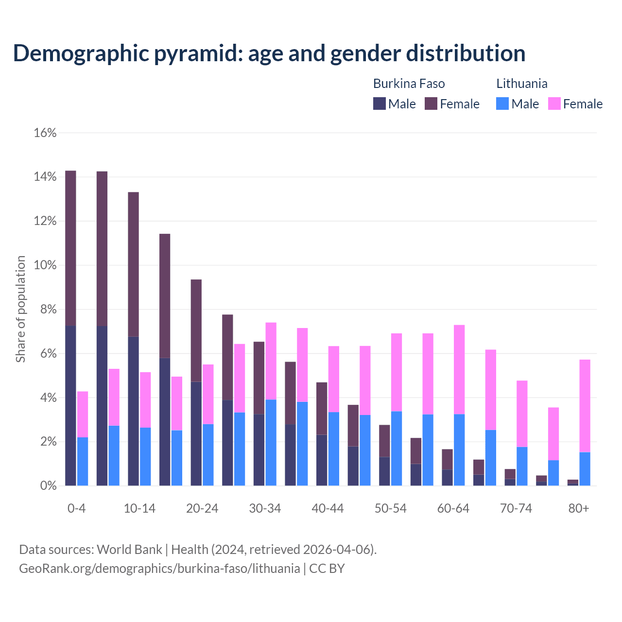 - The share of old-age demographic (65+) in Burkina Faso is 2.65% vs 20.2% in Lithuania.