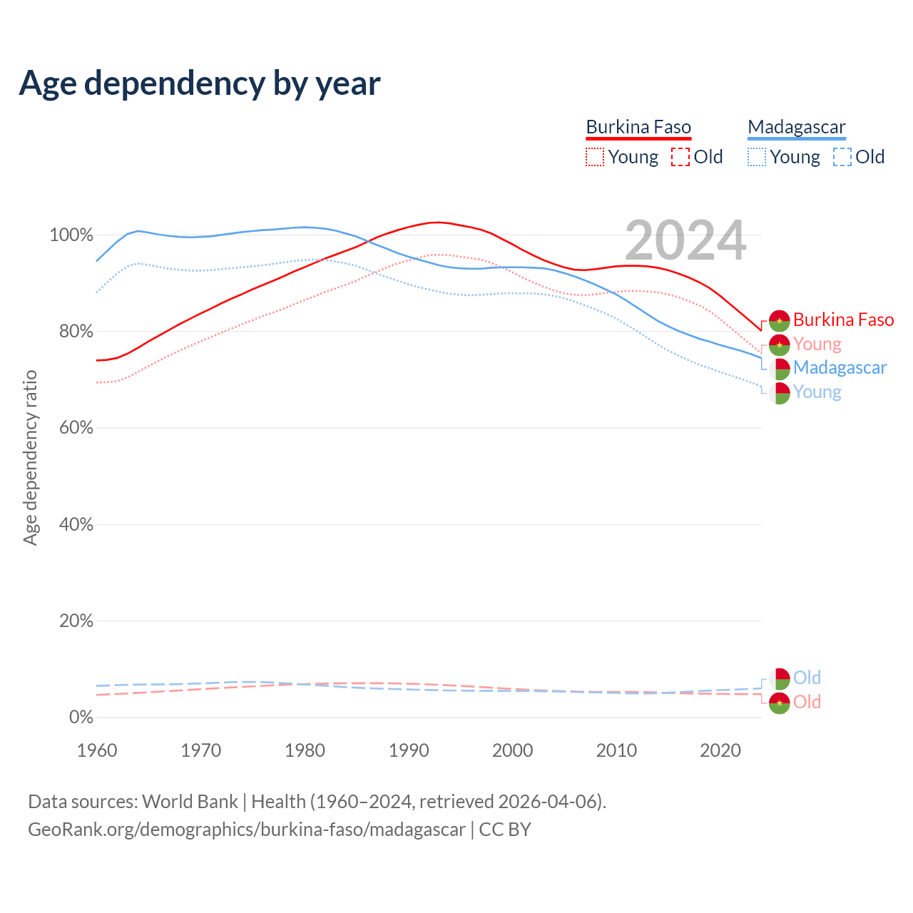 - Burkina Faso is ranked 183/196 by median age (oldest to youngest) vs 165/196 for Madagascar.