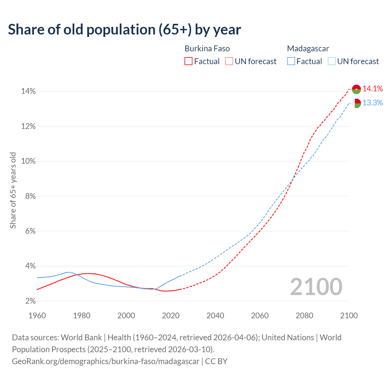 The share of older people aged 65 and over is 2.65% in Burkina Faso and 3.41% in Madagascar. Life expectancy in Burkina Faso compared to Madagascar .