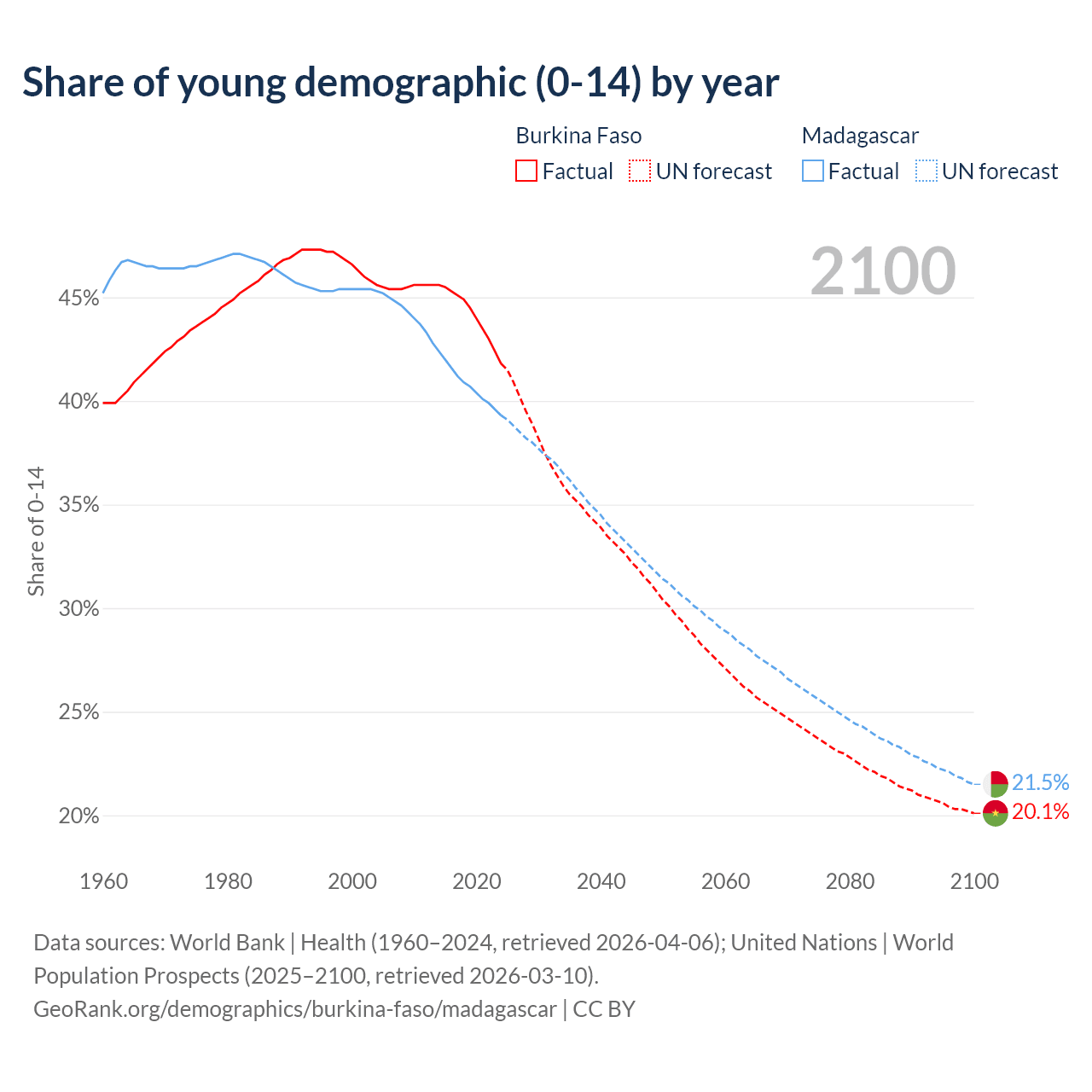 - The share of young demographic (0-15 years old) in Burkina Faso is 41.8% vs 39.3% in Madagascar.