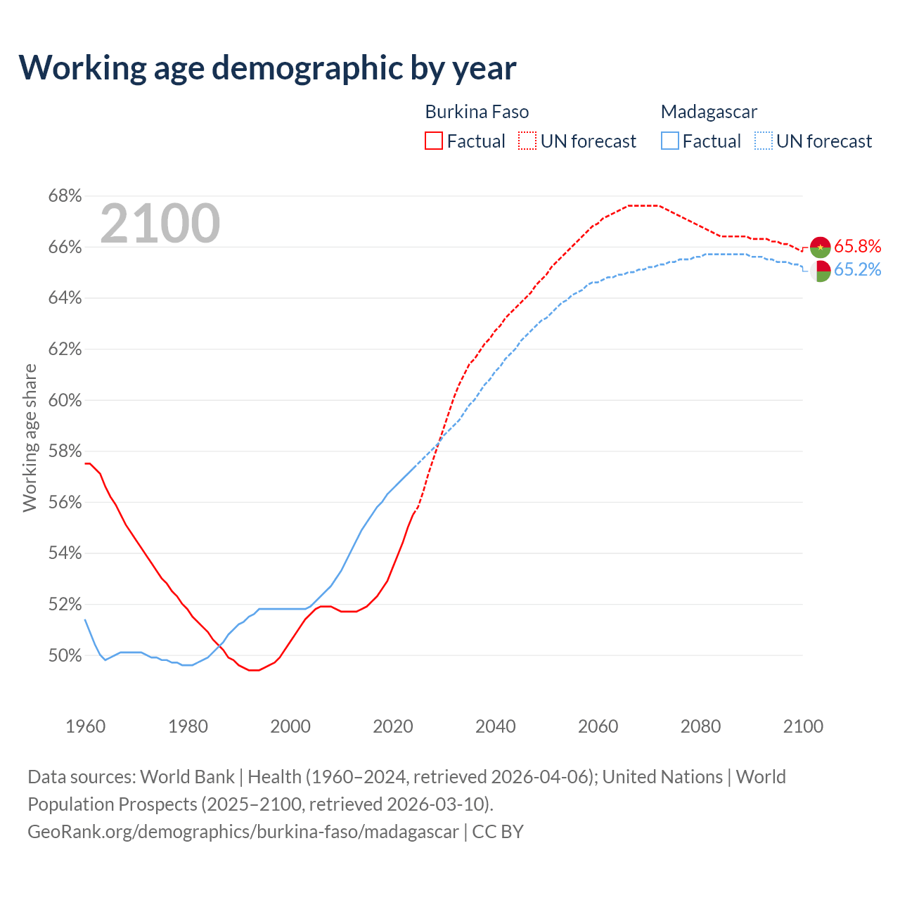 - Burkina Faso has 13.8M working age adults (aged 15-64) vs 19.4M in Madagascar.