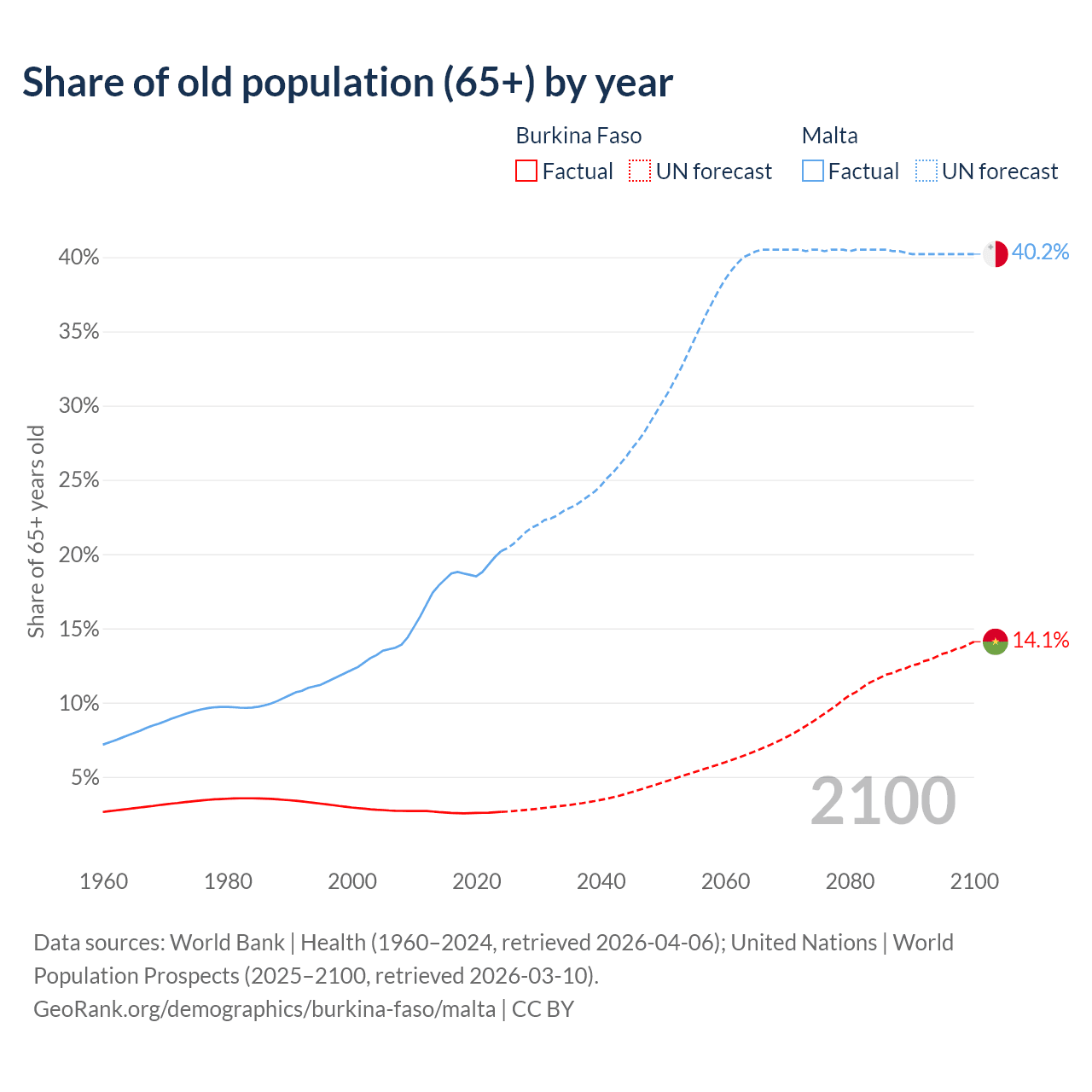 The share of older people aged 65 and over is 2.65% in Burkina Faso and 20.2% in Malta. Life expectancy in Burkina Faso compared to Malta .