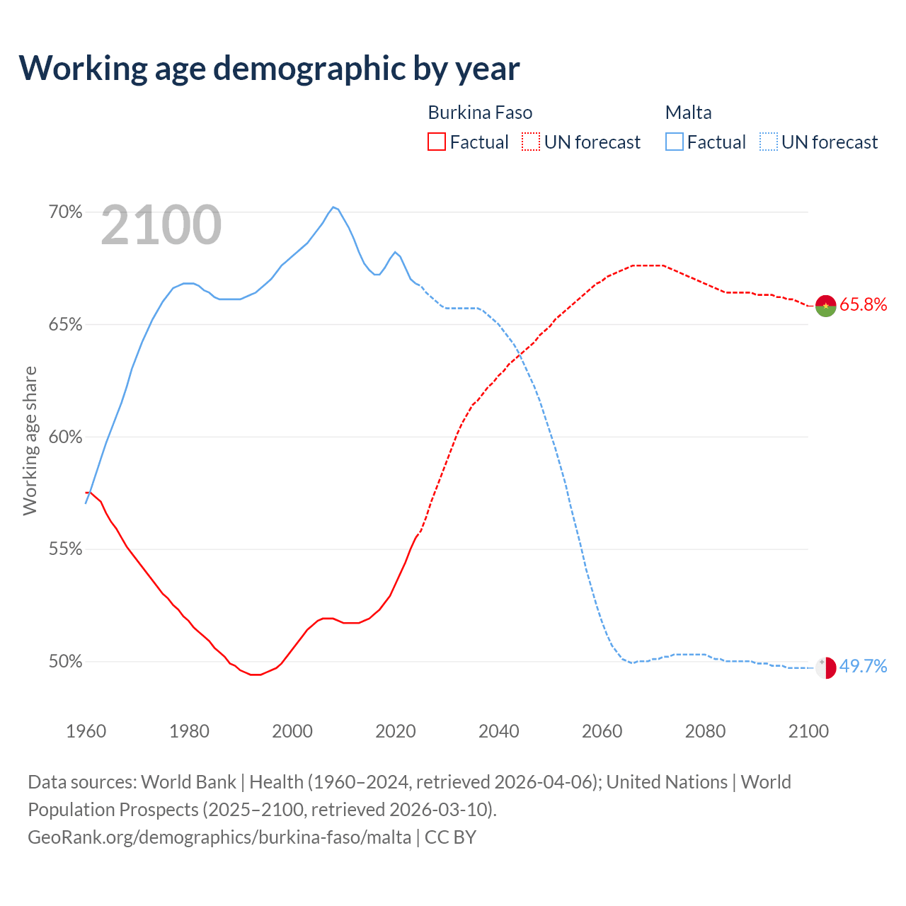 - Burkina Faso has 13.8M working age adults (aged 15-64) vs 388K in Malta.