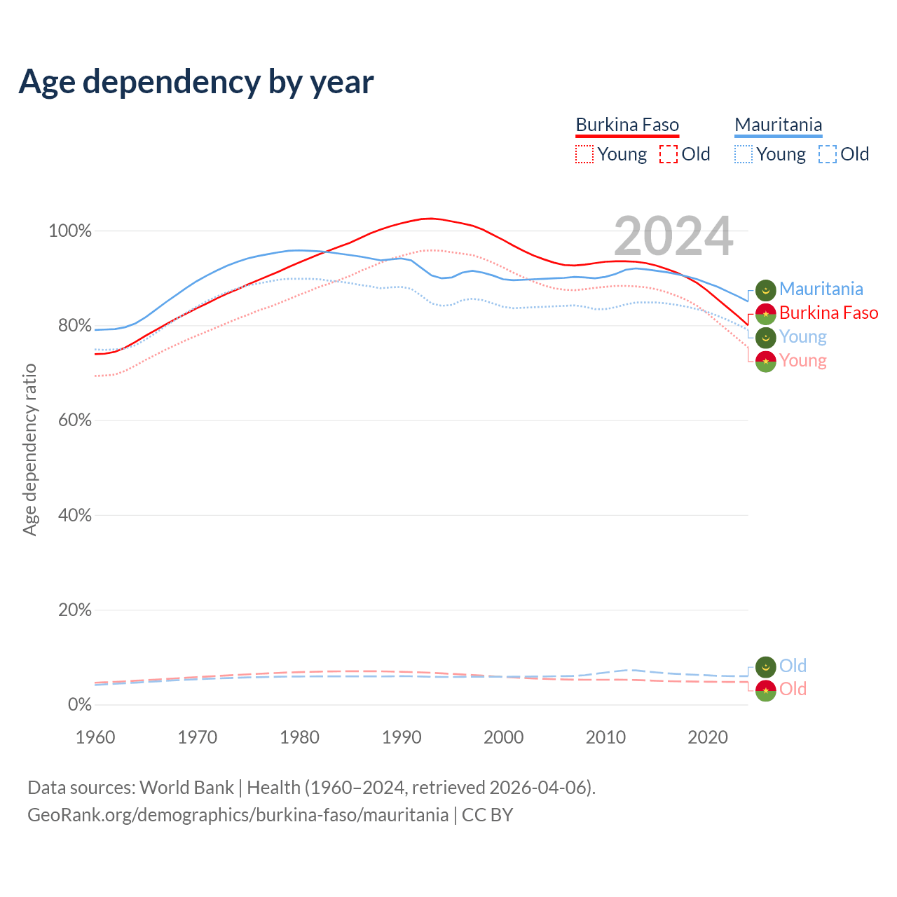 - The share of old-age demographic (65+) in Burkina Faso is 2.65% vs 3.23% in Mauritania.