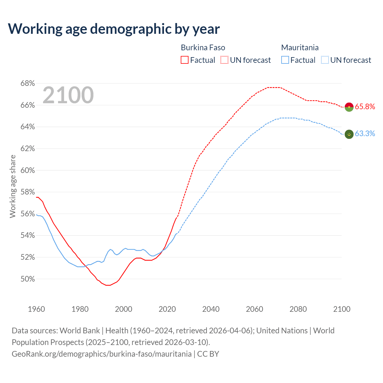 - Burkina Faso has 13.8M working age adults (aged 15-64) vs 2.98M in Mauritania.