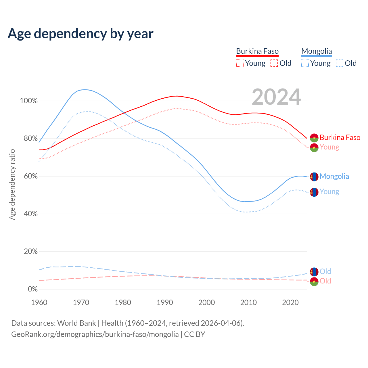 - Burkina Faso is ranked 183/196 by median age (oldest to youngest) vs 117/196 for Mongolia.