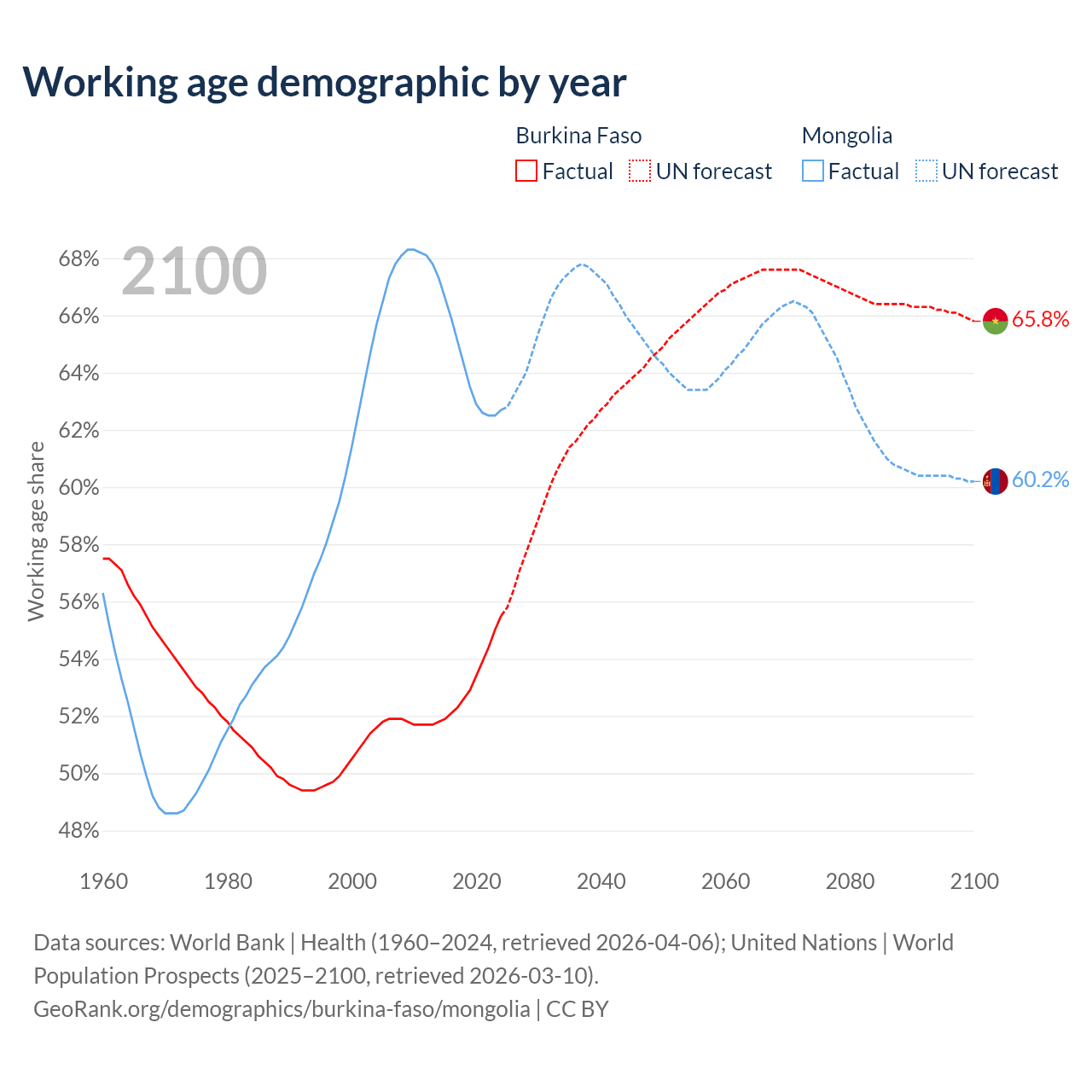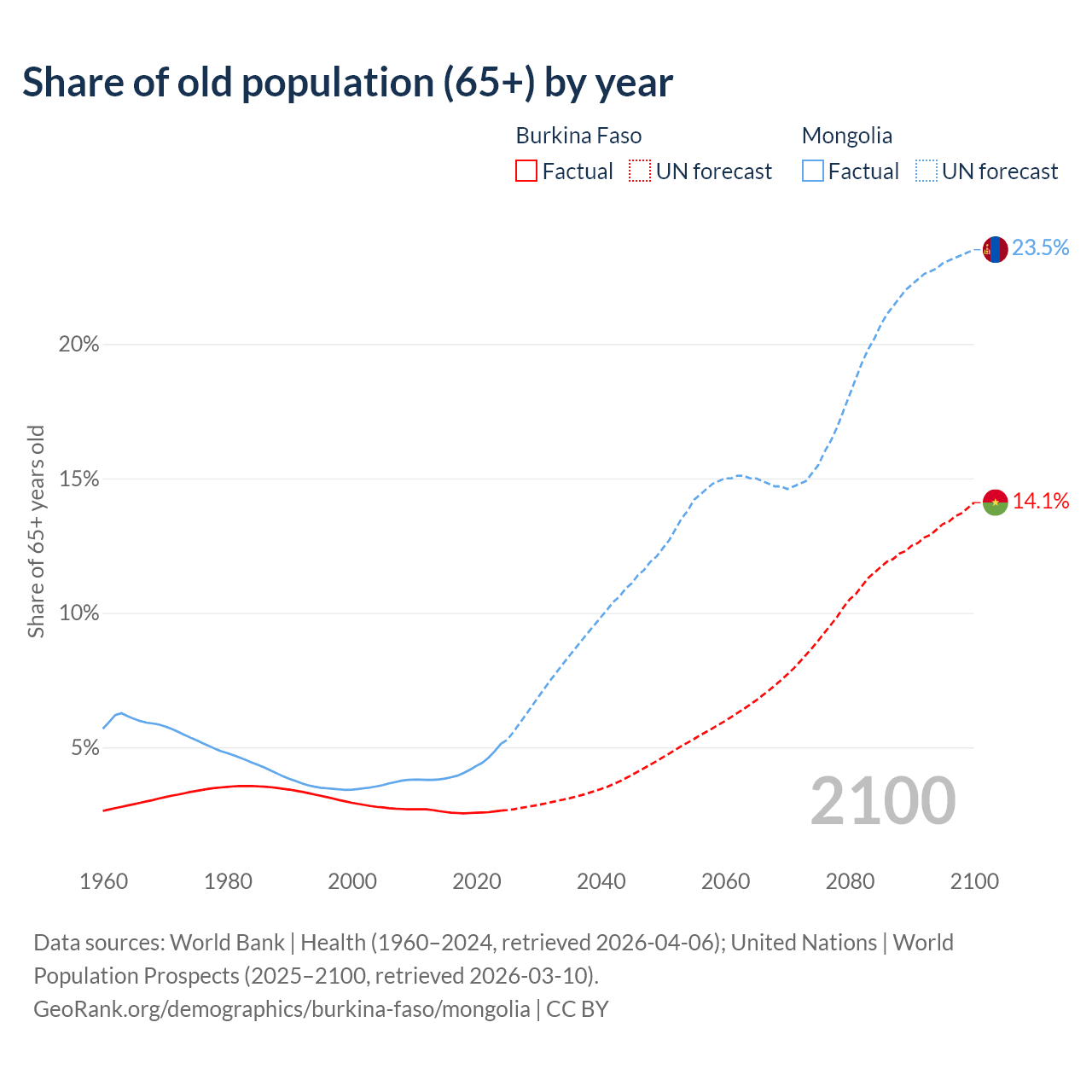 - The share of old-age demographic (65+) in Burkina Faso is 2.65% vs 5.14% in Mongolia.