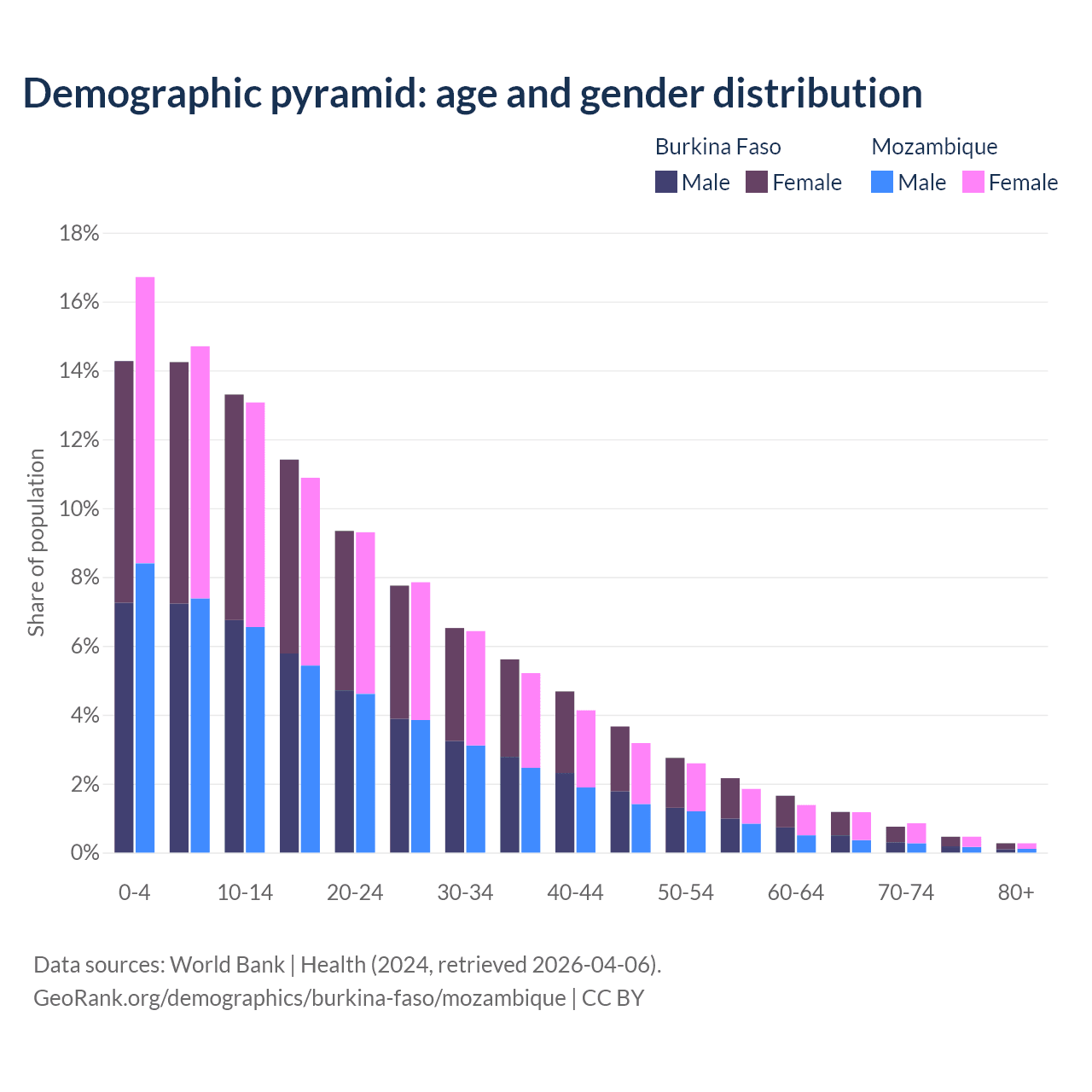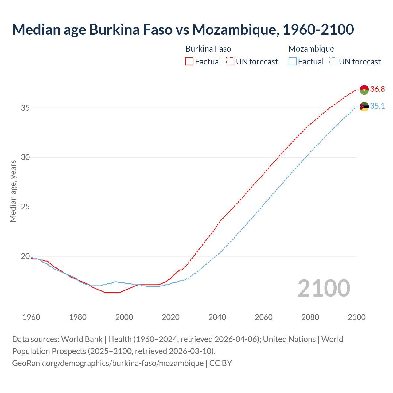 - The median age in Burkina Faso is 18.6 years compared to 17.5 years in Mozambique.