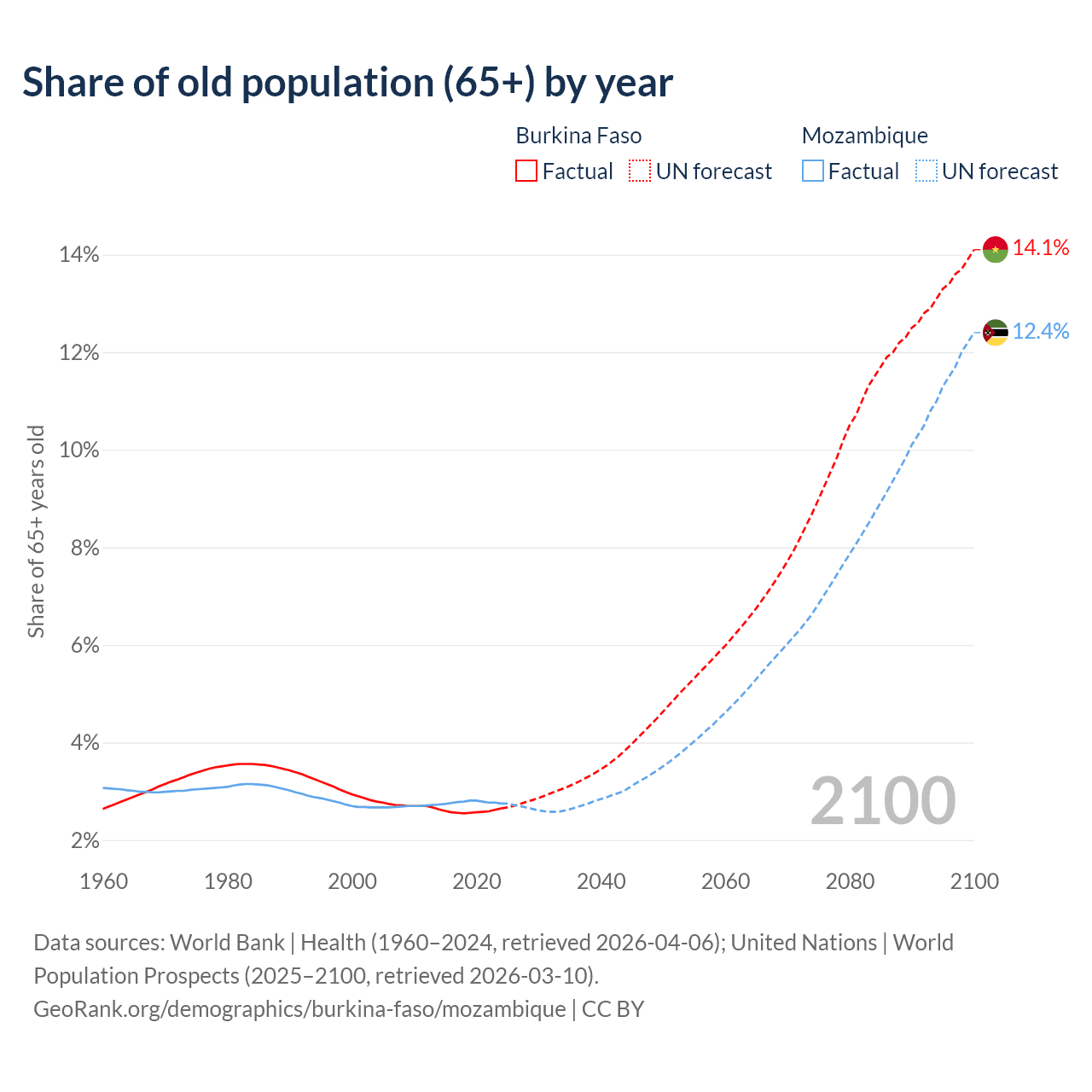 The share of older people aged 65 and over is 2.65% in Burkina Faso and 2.75% in Mozambique. Life expectancy in Burkina Faso compared to Mozambique .