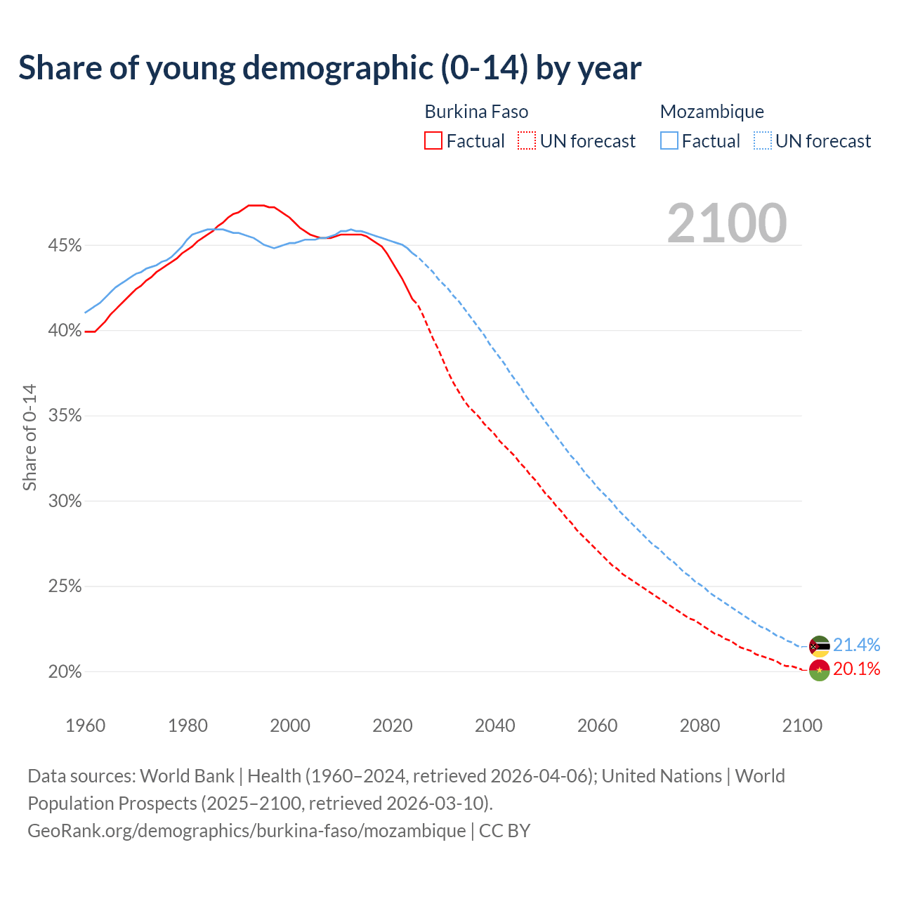 - The share of young demographic (0-15 years old) in Burkina Faso is 41.8% vs 44.5% in Mozambique.