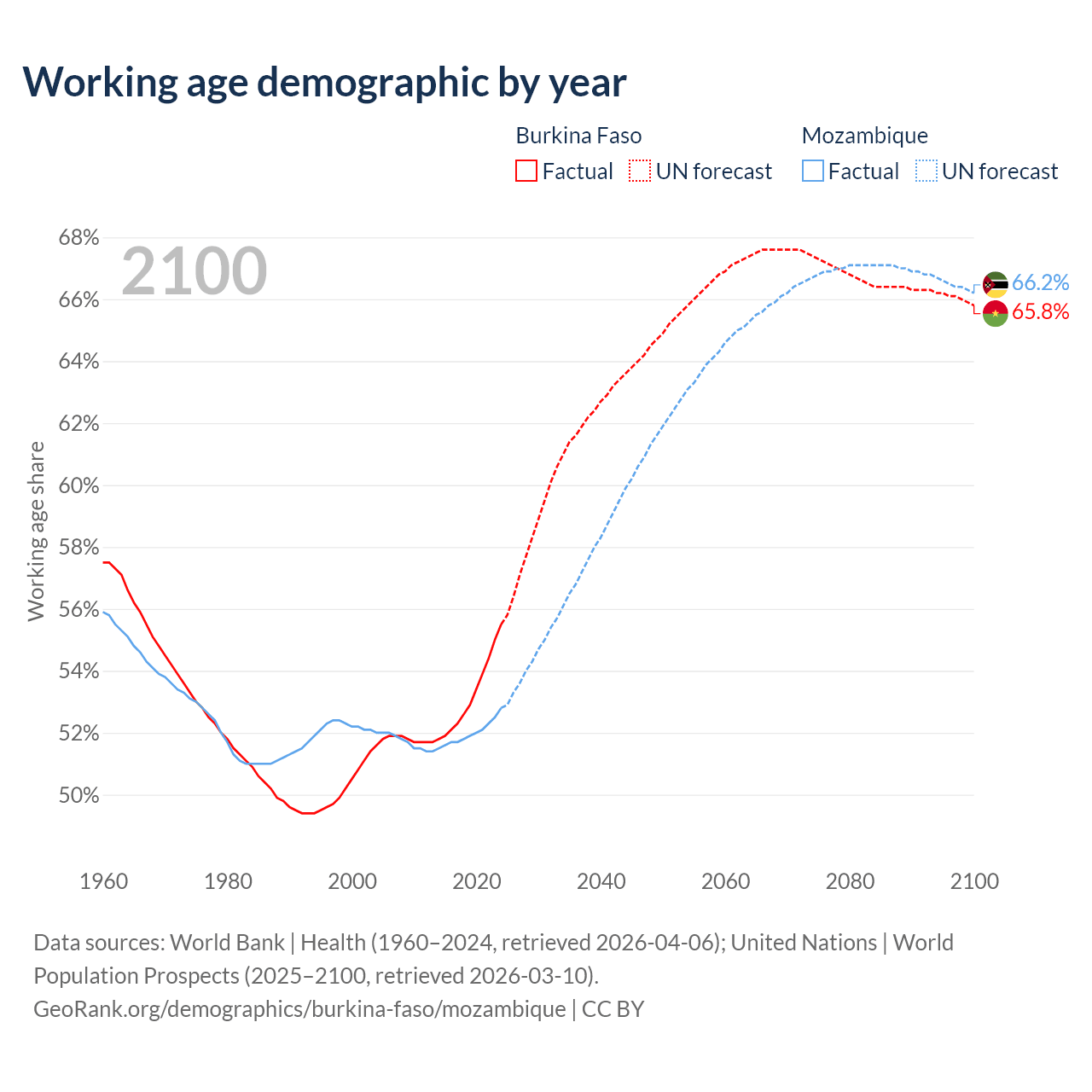 - Burkina Faso has 13.8M working age adults (aged 15-64) vs 19.5M in Mozambique.