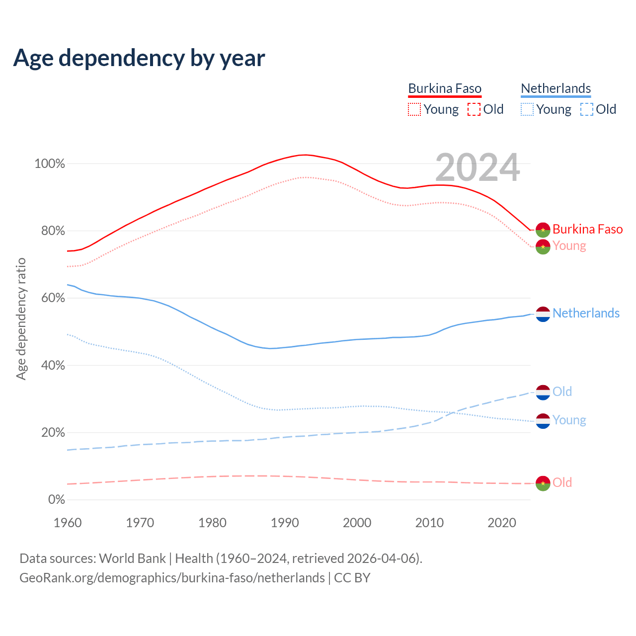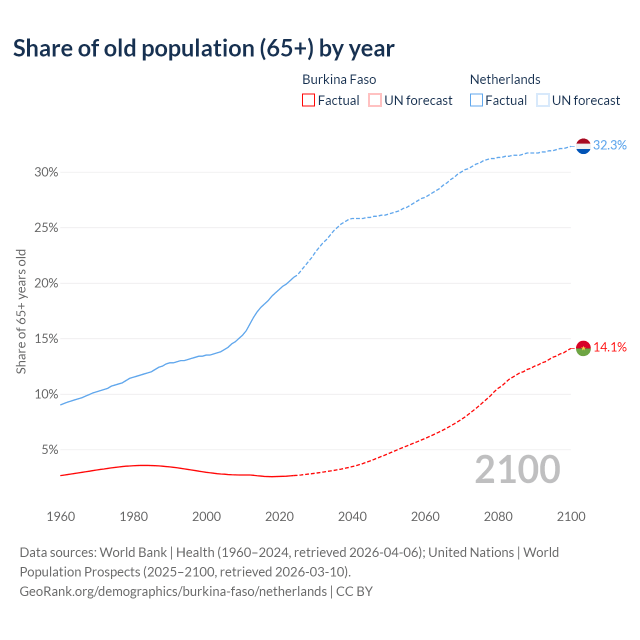 - The share of old-age demographic (65+) in Burkina Faso is 2.65% vs 20.5% in the Netherlands.