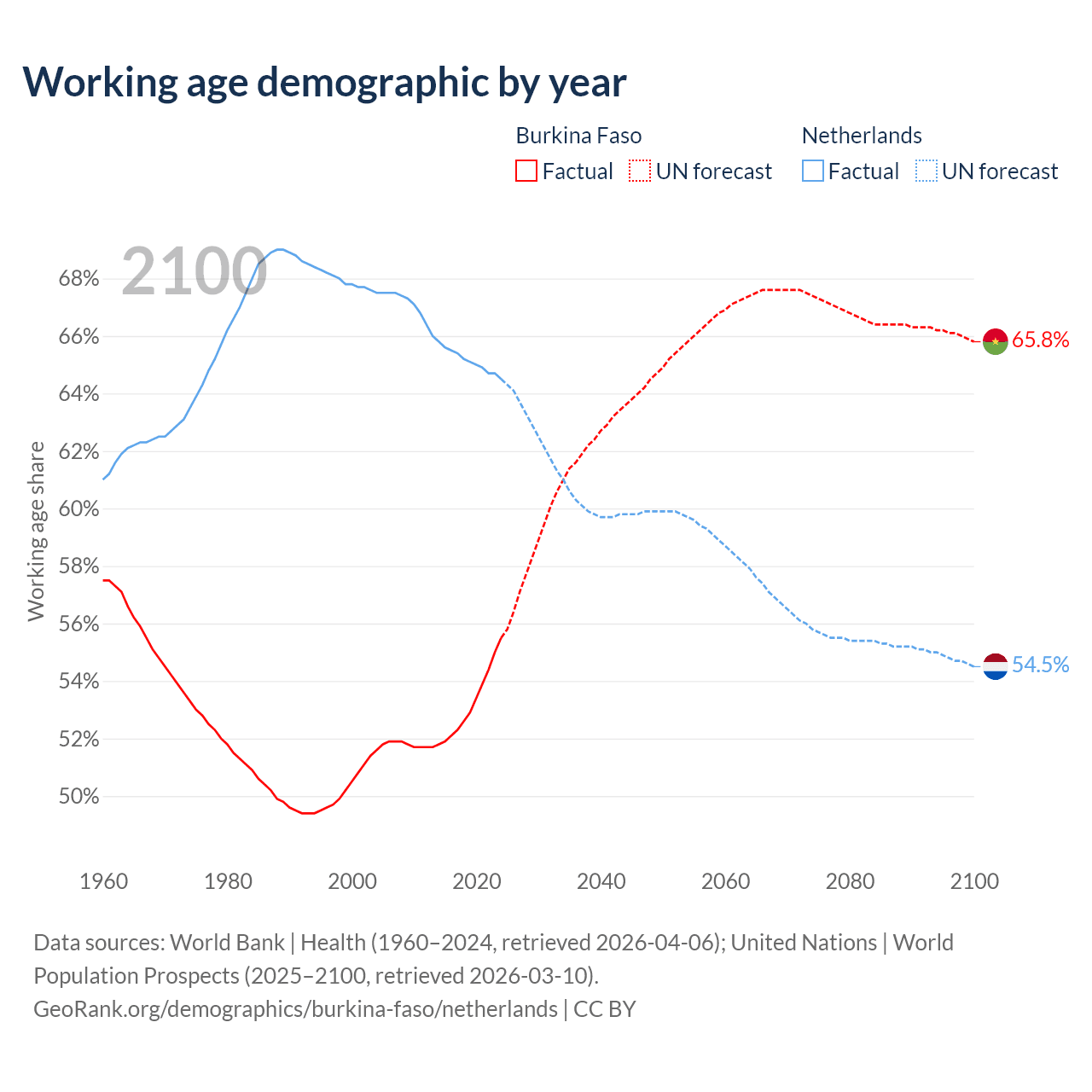- Burkina Faso has 13.8M working age adults (aged 15-64) vs 11.8M in the Netherlands.
