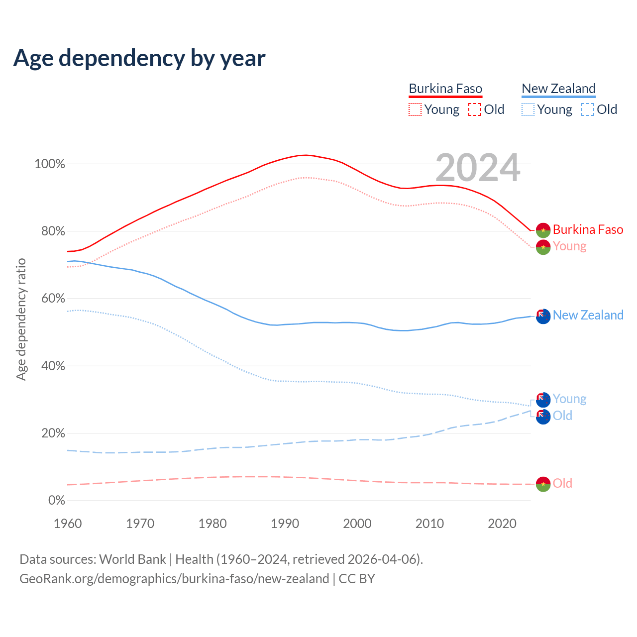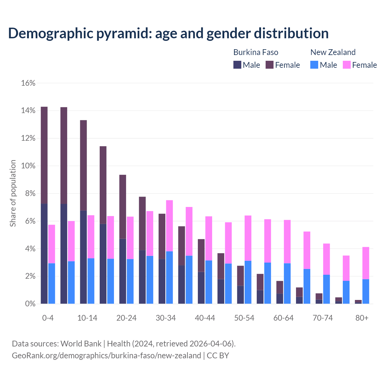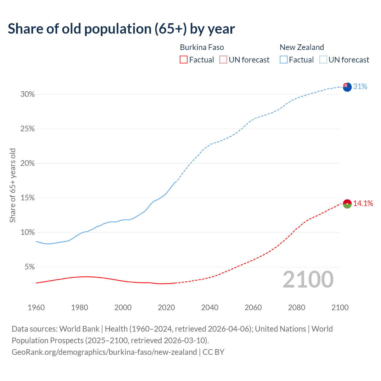 - The share of old-age demographic (65+) in Burkina Faso is 2.65% vs 17.2% in New Zealand.