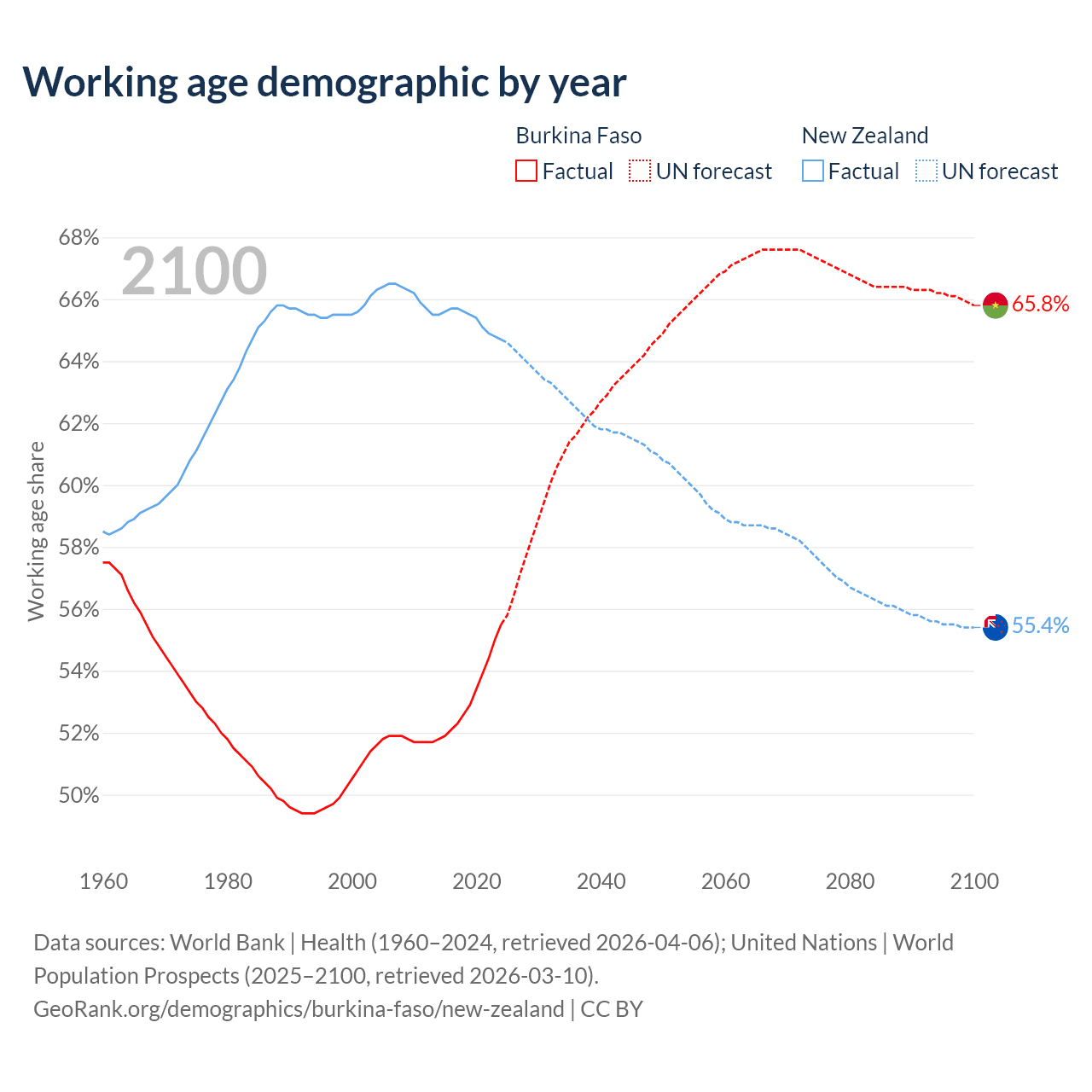 - Burkina Faso has 13.8M working age adults (aged 15-64) vs 3.48M in New Zealand.