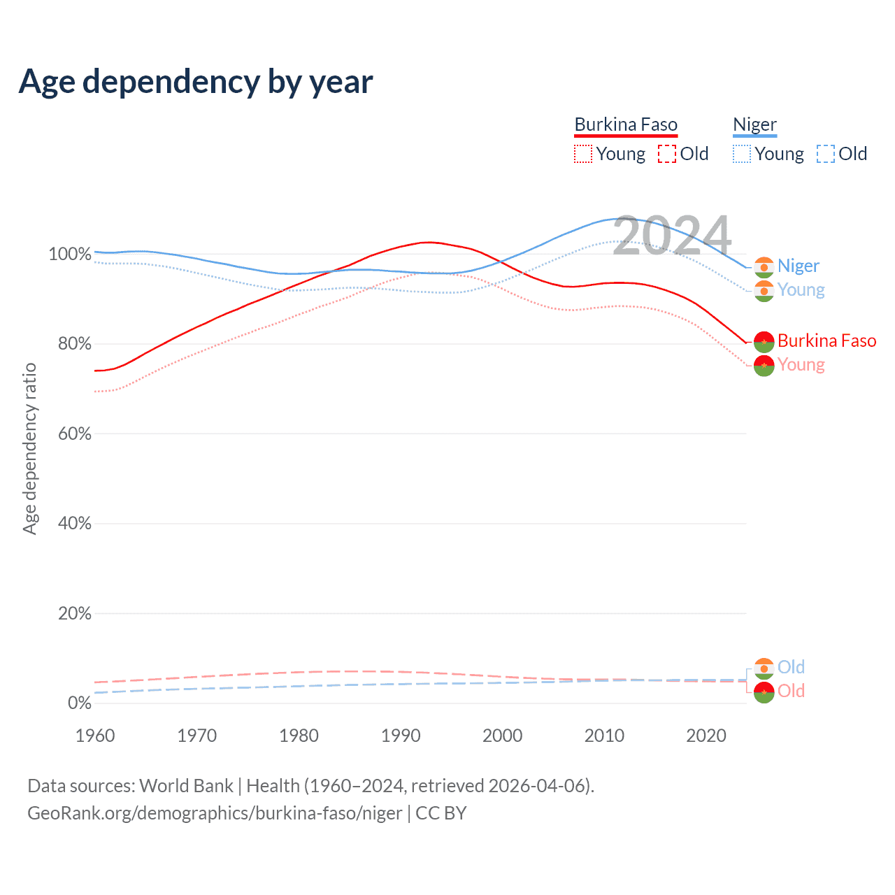 - The share of old-age demographic (65+) in Burkina Faso is 2.65% vs 2.59% in Niger.