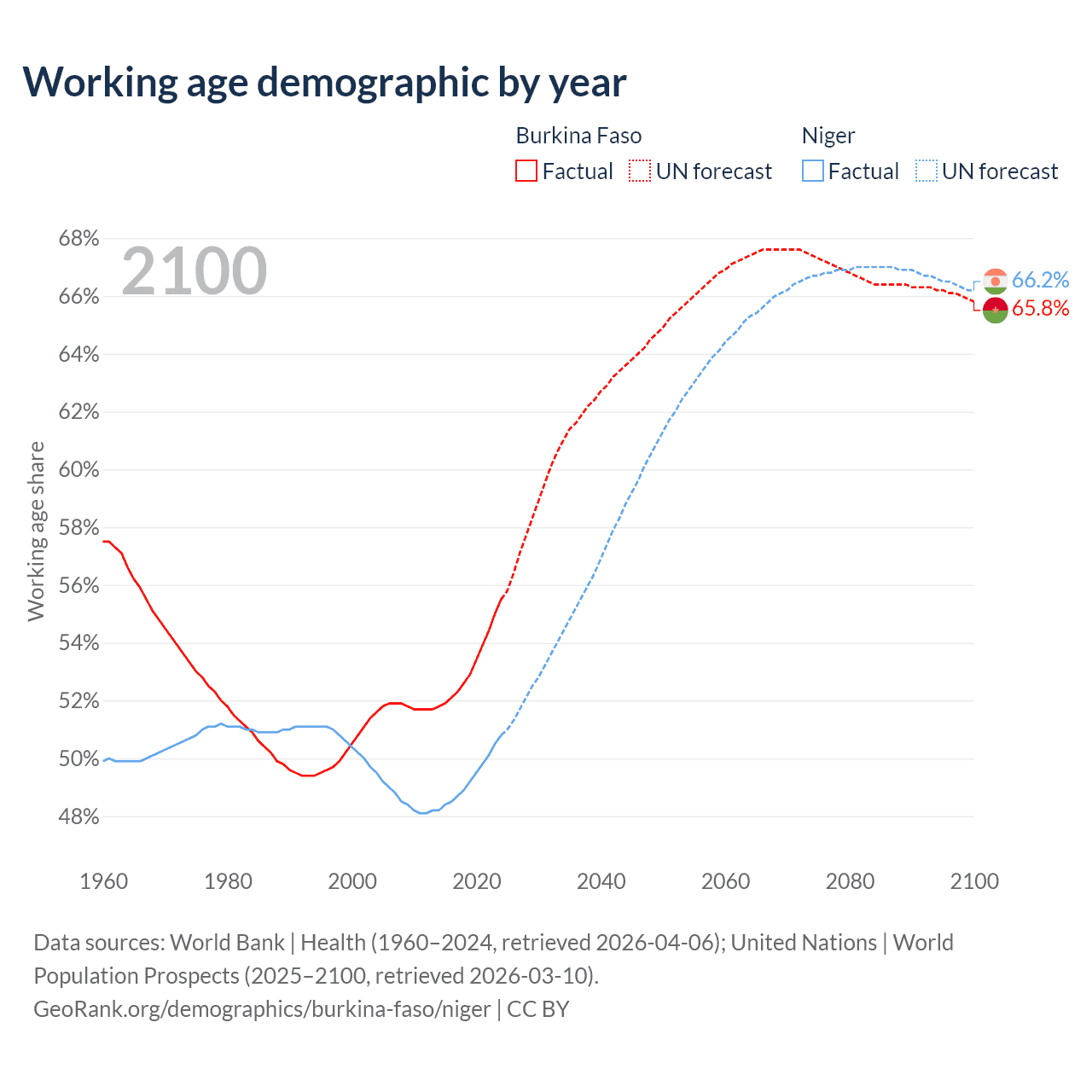 The share of older people aged 65 and over is 2.65% in Burkina Faso and 2.59% in Niger. Life expectancy in Burkina Faso compared to Niger .