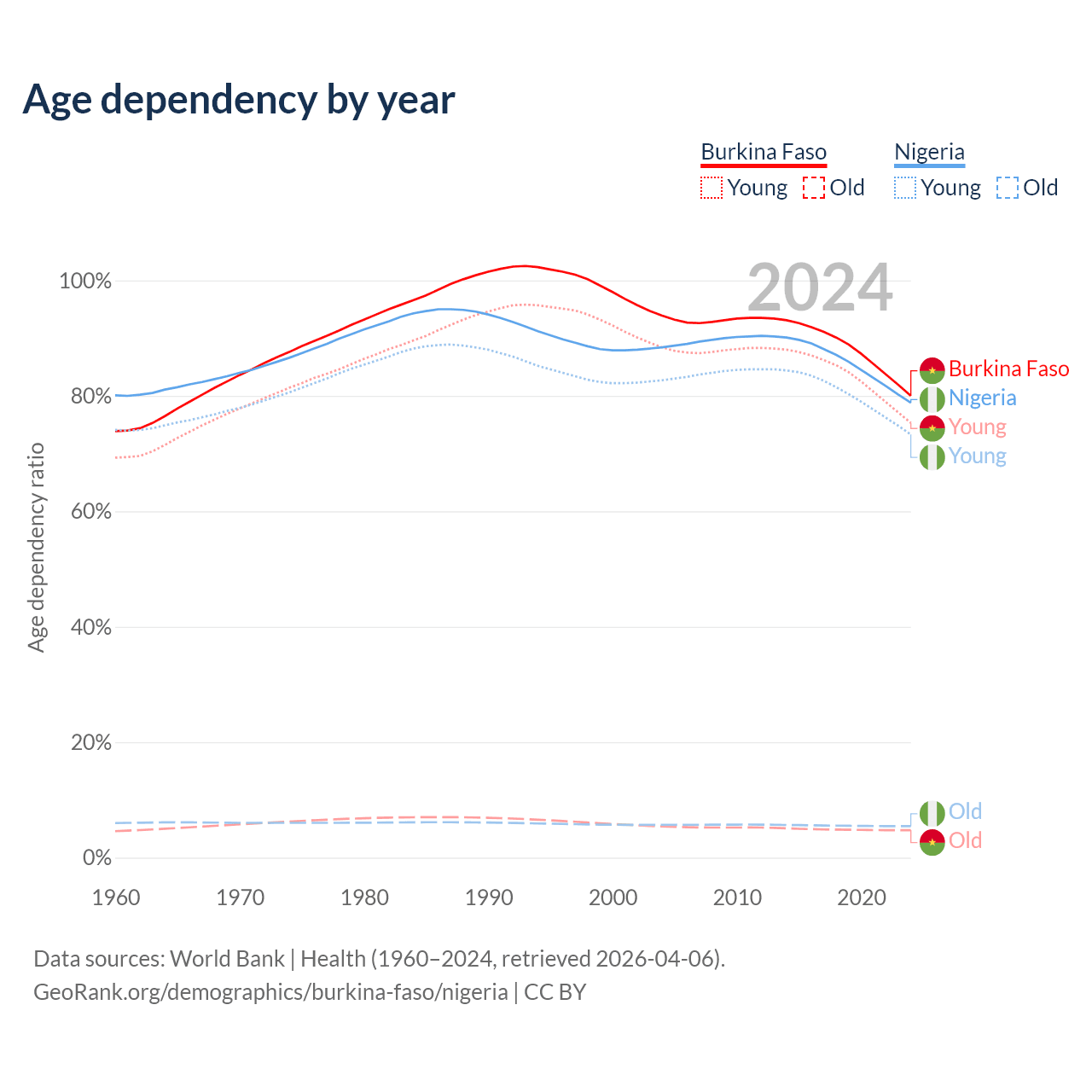 Data sources: World Bank | Health (1960–2024, retrieved 2026-04-06); U.S. Census Bureau (1960–2024, retrieved 2026-02-08).
