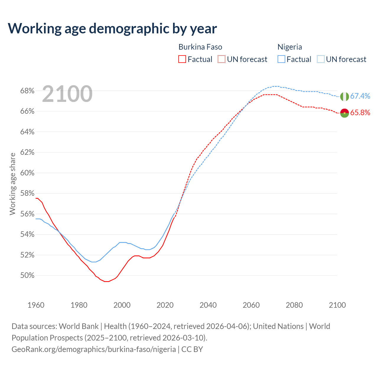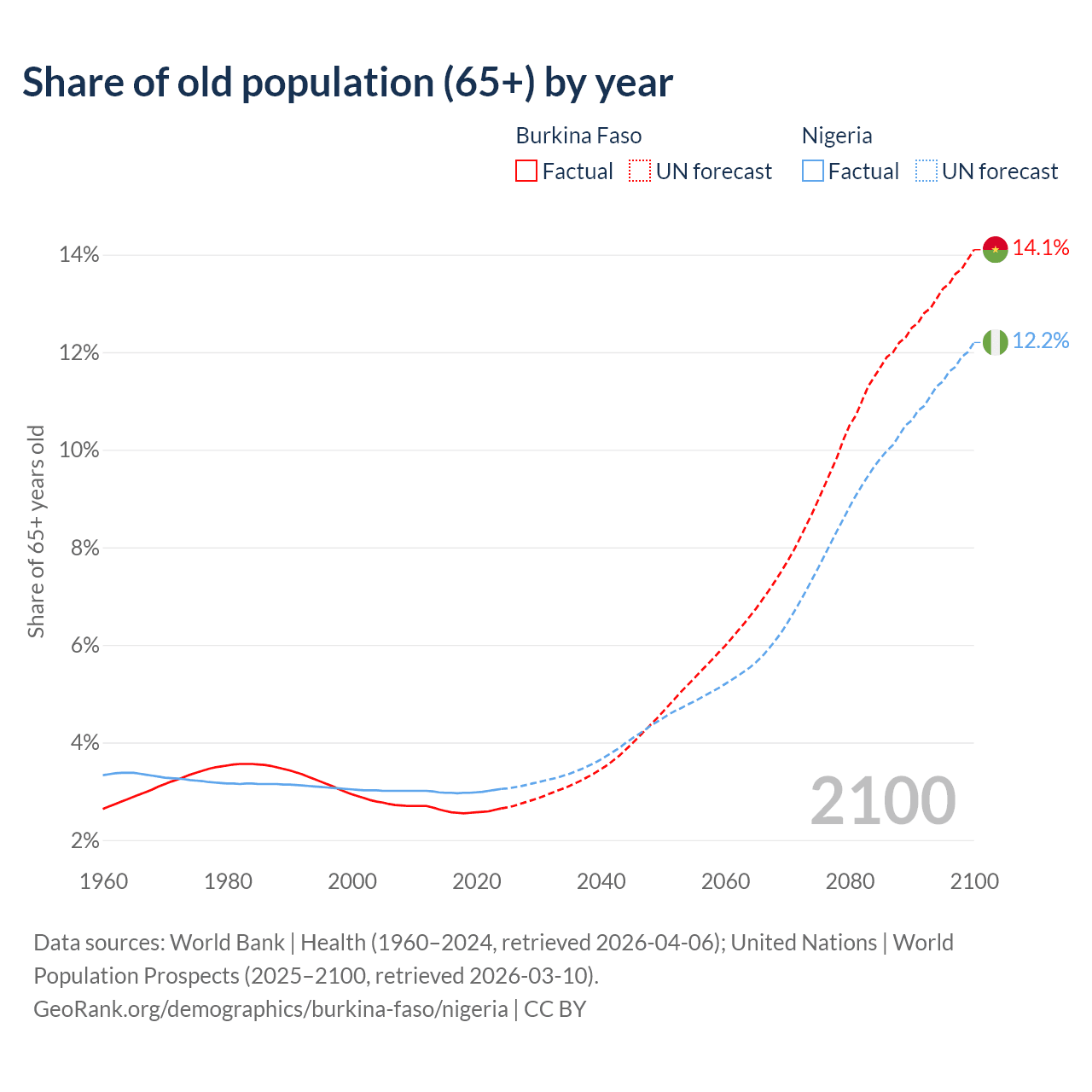 The share of older people aged 65 and over is 2.65% in Burkina Faso and 3.05% in Nigeria. Life expectancy in Burkina Faso compared to Nigeria .