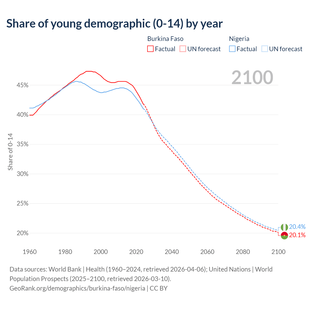 Median age Burkina Faso vs Nigeria, 1960-2100