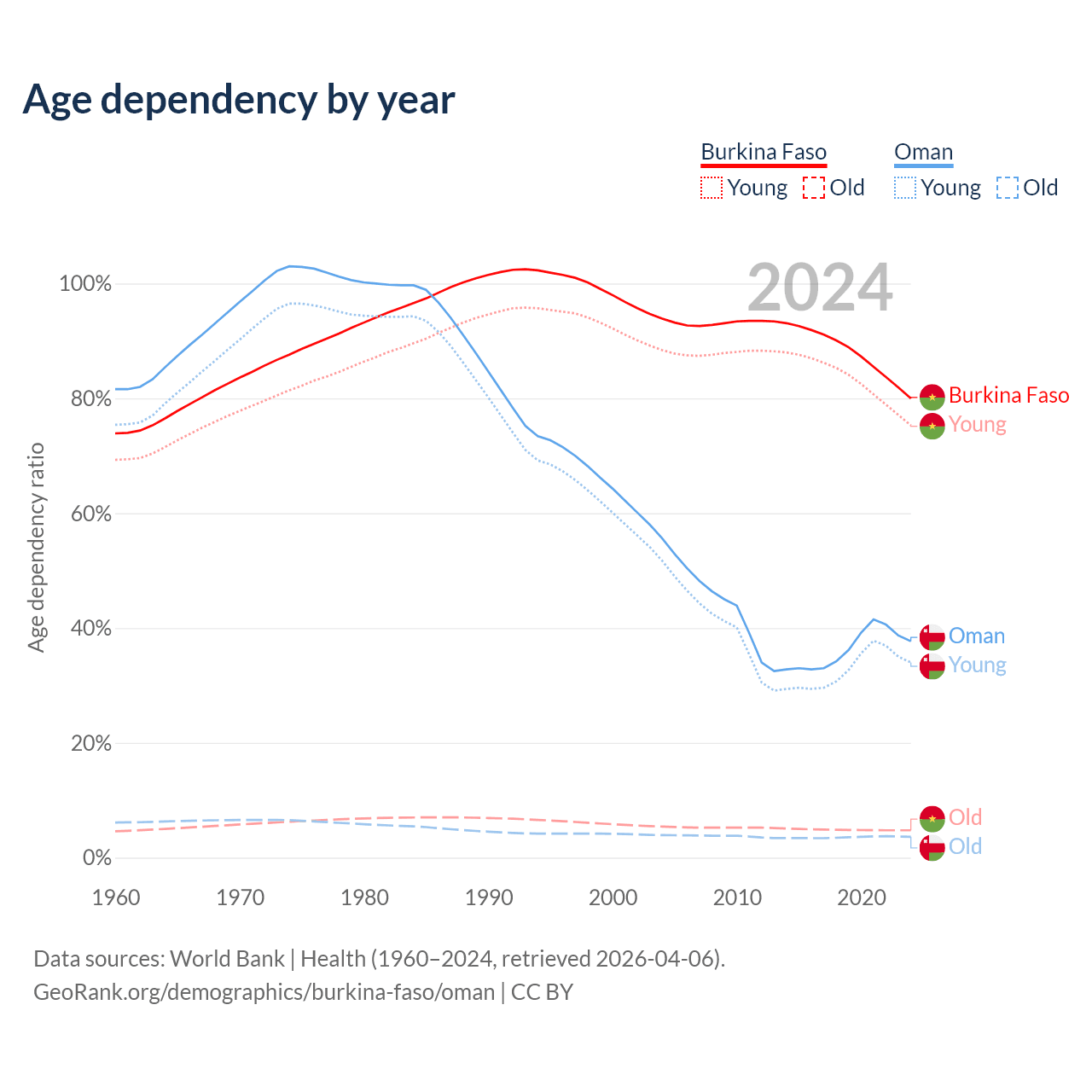 - The share of old-age demographic (65+) in Burkina Faso is 2.65% vs 2.64% in Oman.