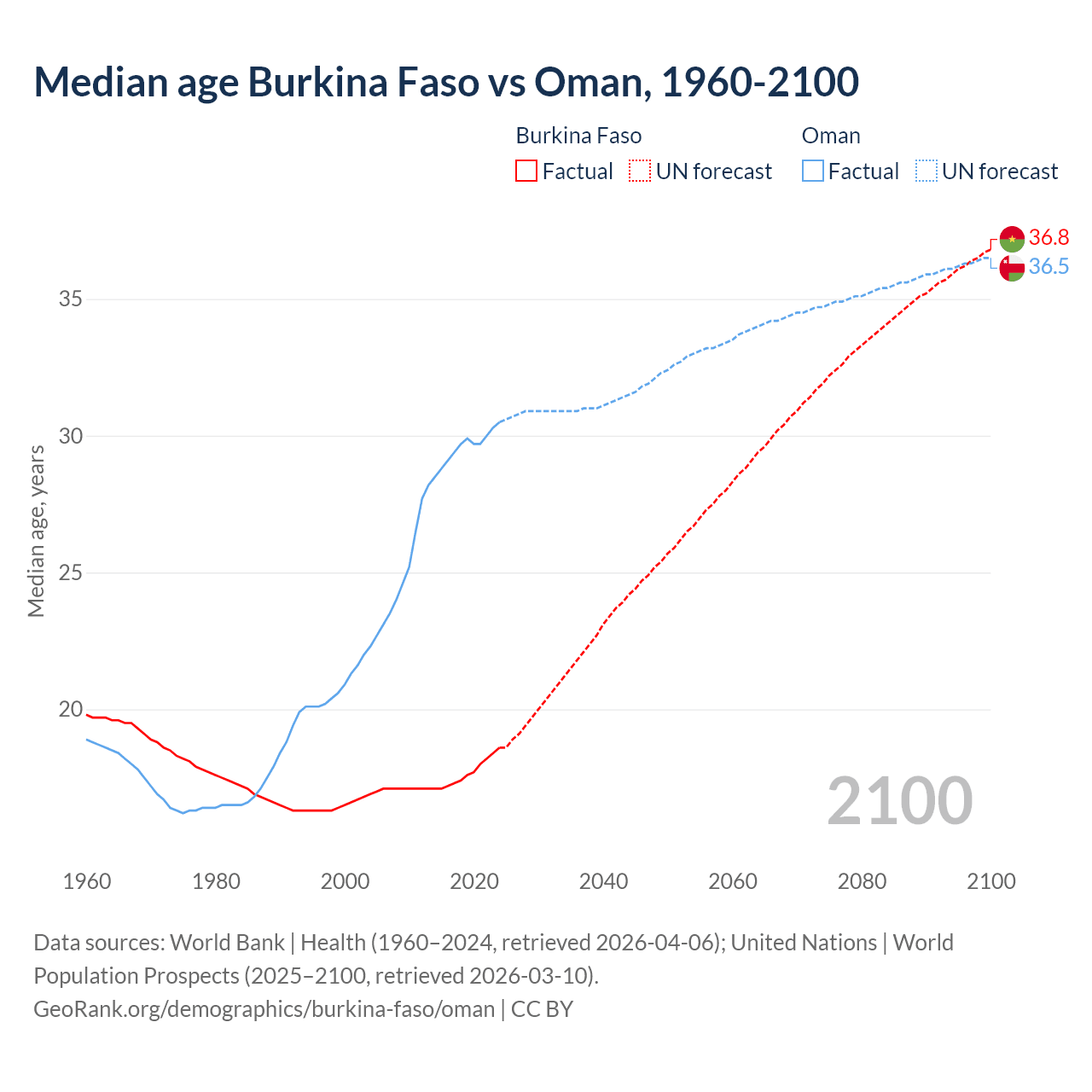 - Burkina Faso is ranked 183/196 by median age (oldest to youngest) vs 101/196 for Oman.